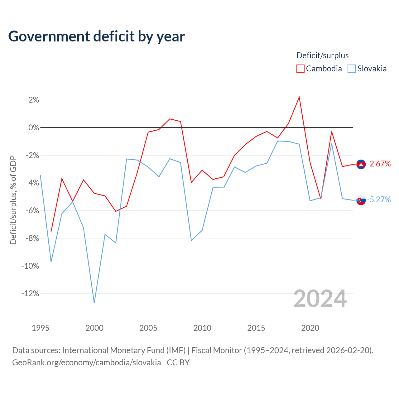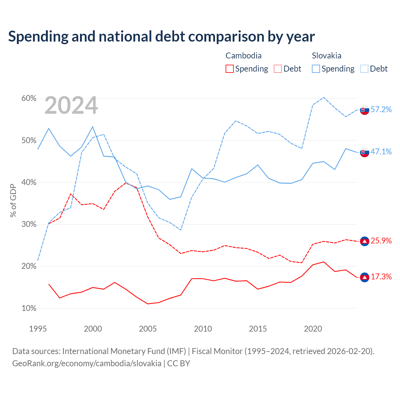 Cambodia has $12B in government debt (25.9% of GDP), compared to $80.7B (57.2% of GDP) in Slovakia.