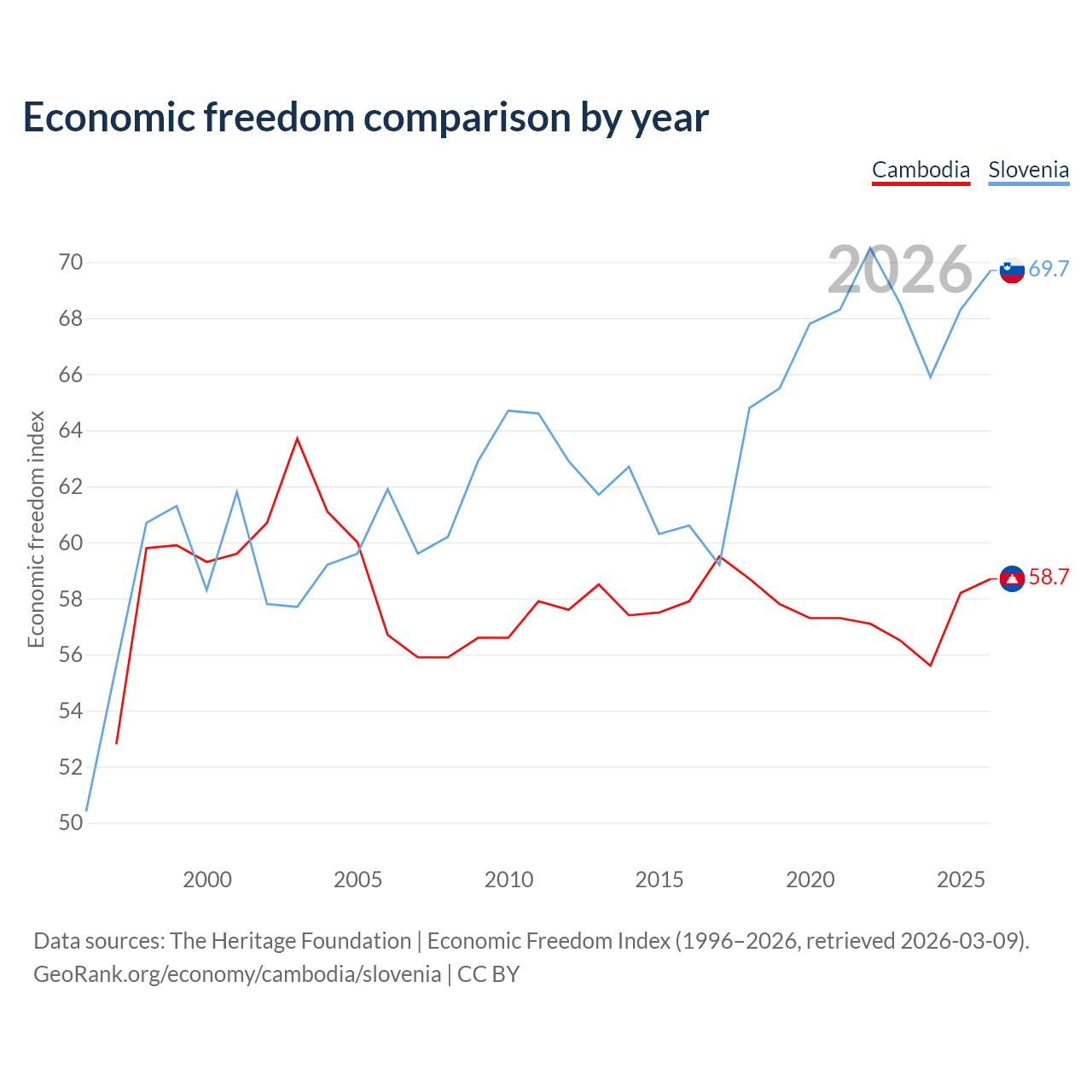 The Economic Freedom Index for Cambodia is 58.7, ranking 108/197, compared to 69.7 for Slovenia, ranking 40/197. The chart above displays a comparison of annual changes in economic freedom indexes.
