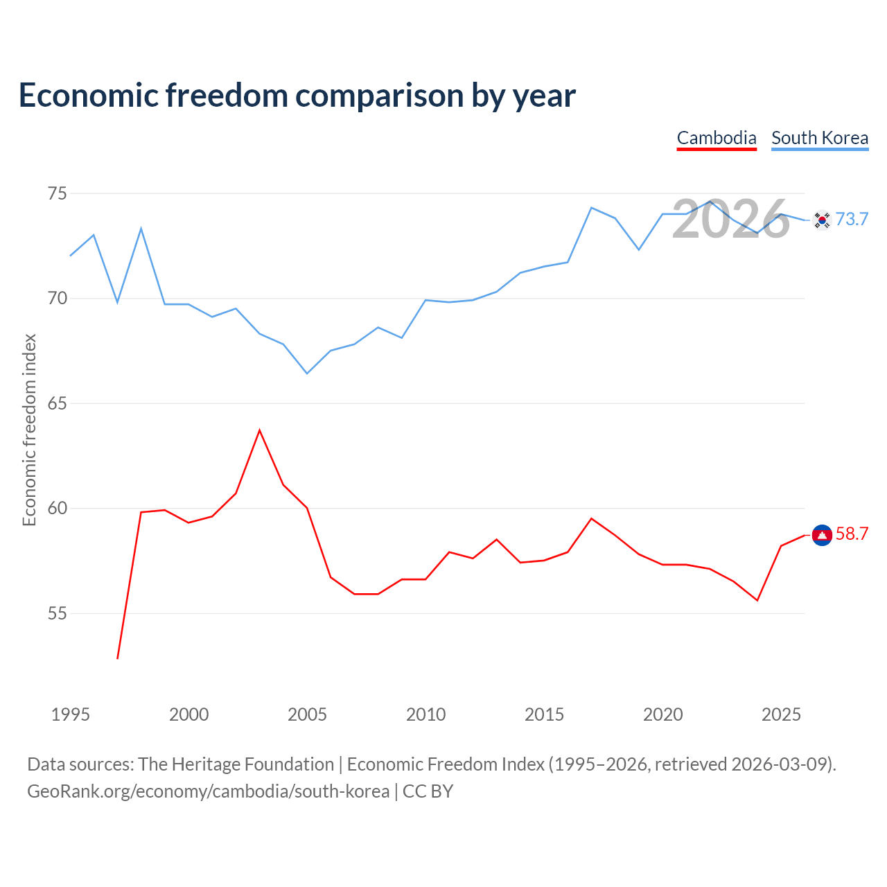 The Economic Freedom Index for Cambodia is 58.7, ranking 108/197, compared to 73.7 for South Korea, ranking 24/197. The chart above displays a comparison of annual changes in economic freedom indexes.