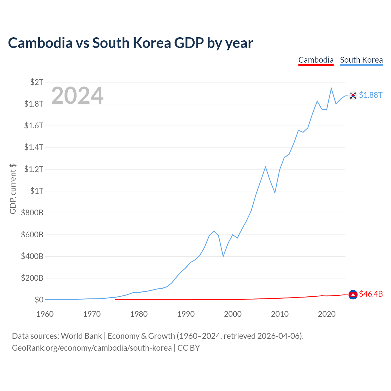 Cambodia has a GDP of $46.4B compared to $1.88T for South Korea, ranking 97/197 and 12/197 by economy size, respectively.
