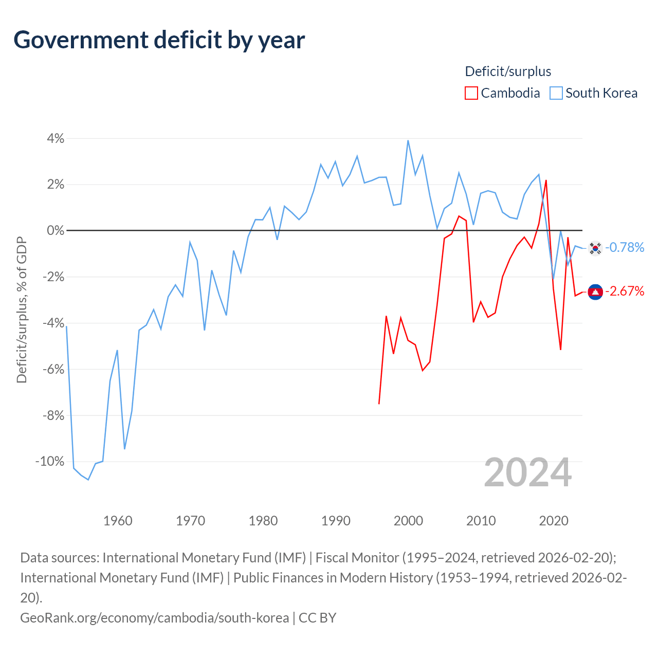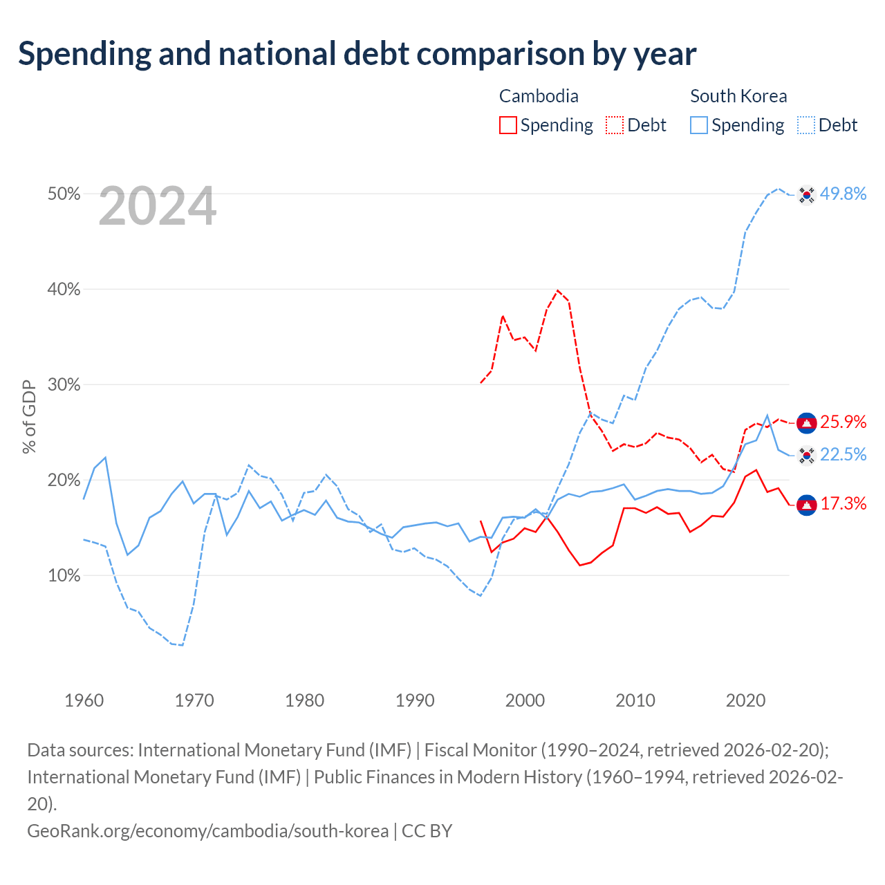 Cambodia has $12B in government debt (25.9% of GDP), compared to $934B (49.8% of GDP) in South Korea.