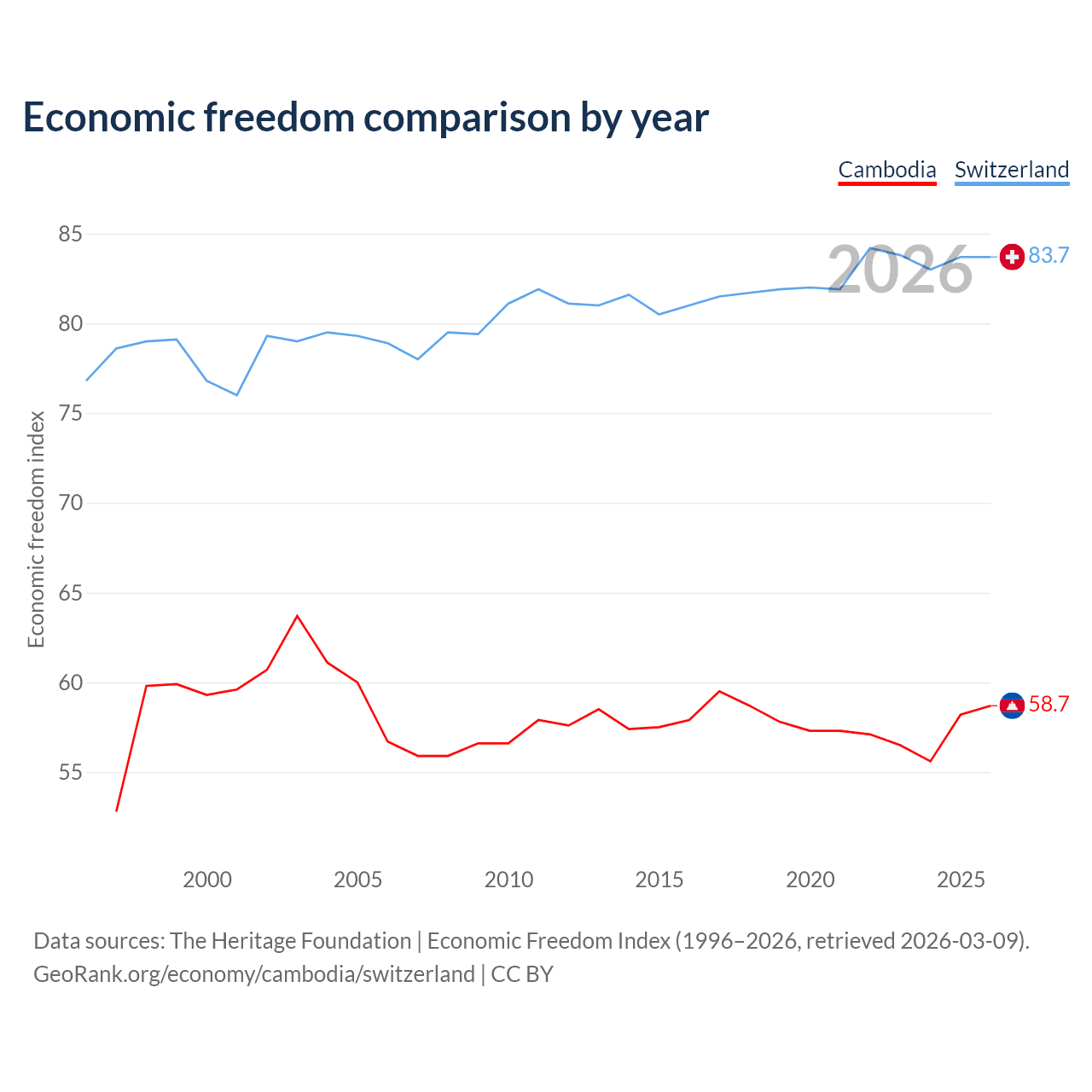 The Economic Freedom Index for Cambodia is 58.7, ranking 108/197, compared to 83.7 for Switzerland, ranking 2/197. The chart above displays a comparison of annual changes in economic freedom indexes.