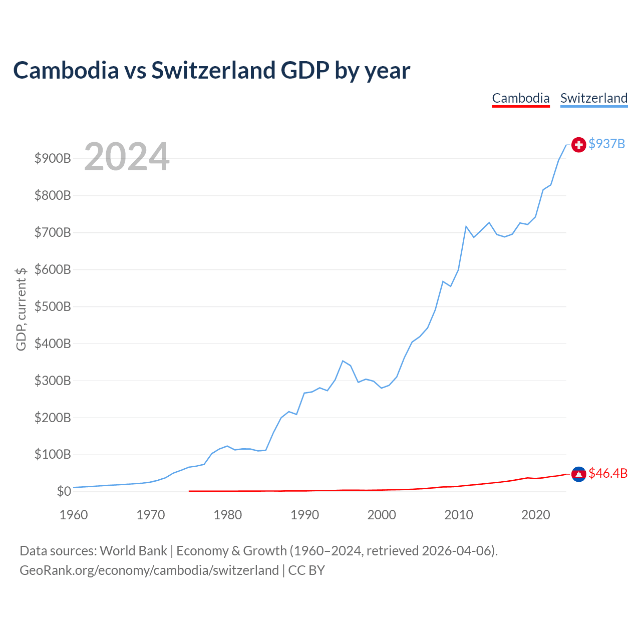 Cambodia has a GDP of $46.4B compared to $937B for Switzerland, ranking 97/197 and 20/197 by economy size, respectively.