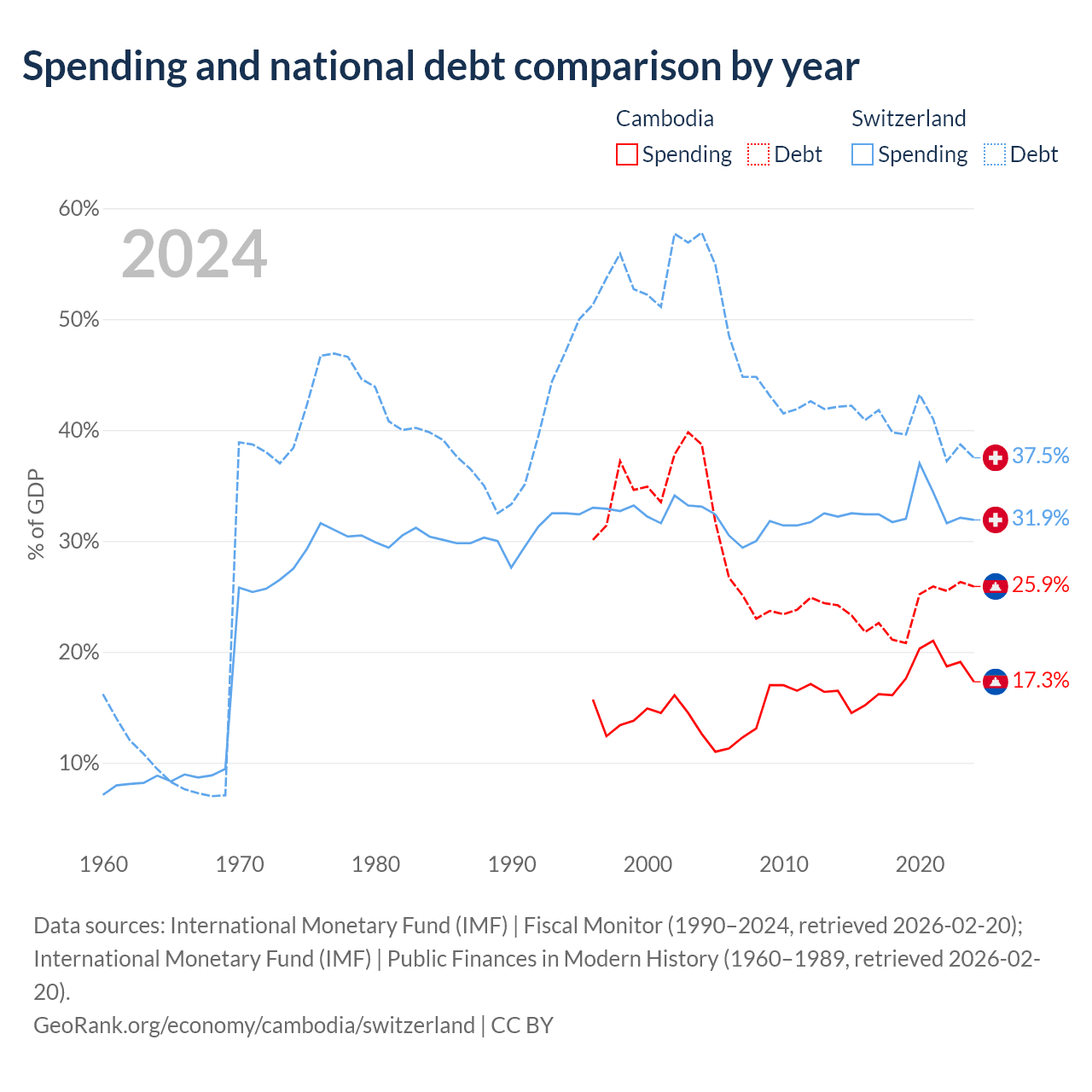 Cambodia has $12B in government debt (25.9% of GDP), compared to $351B (37.5% of GDP) in Switzerland.