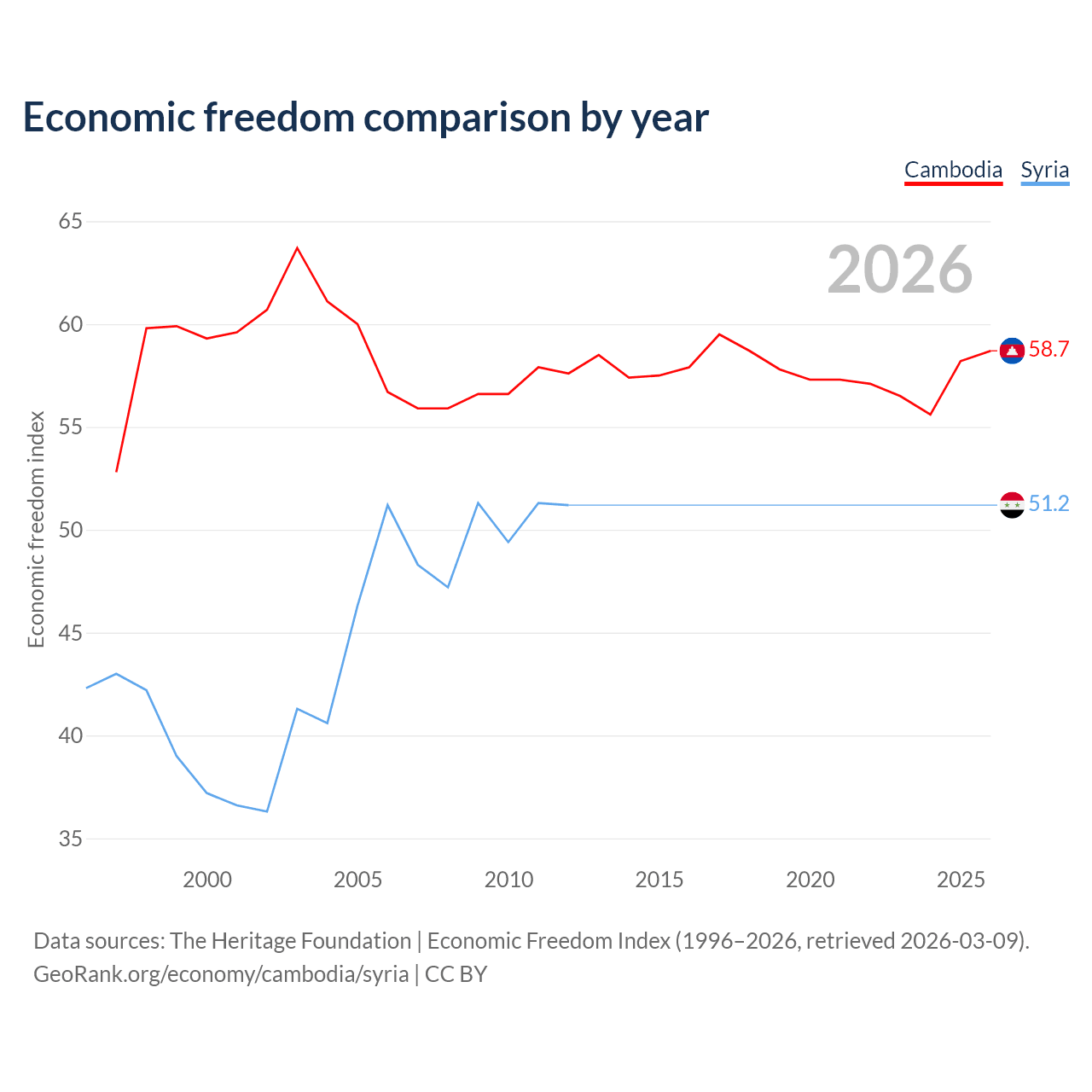The Economic Freedom Index for Cambodia is 58.7, ranking 108/197, compared to 51.2 for Syria, ranking 155/197. The chart above displays a comparison of annual changes in economic freedom indexes.