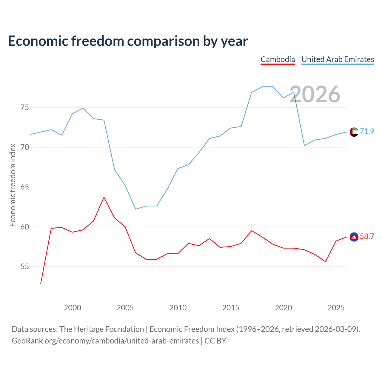 The Economic Freedom Index for Cambodia is 58.7, ranking 108/197, compared to 71.9 for the United Arab Emirates, ranking 29/197. The chart above displays a comparison of annual changes in economic freedom indexes.