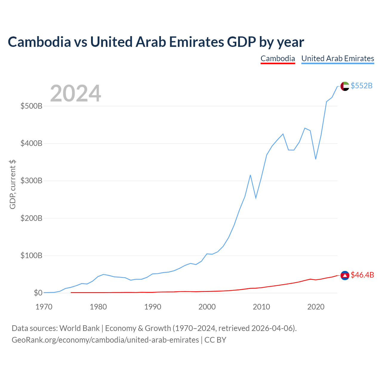 Cambodia has a GDP of $46.4B compared to $552B for the United Arab Emirates, ranking 97/197 and 27/197 by economy size, respectively.