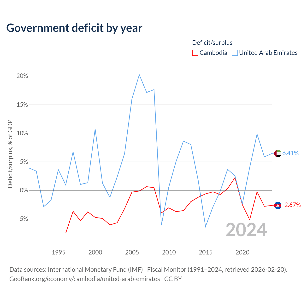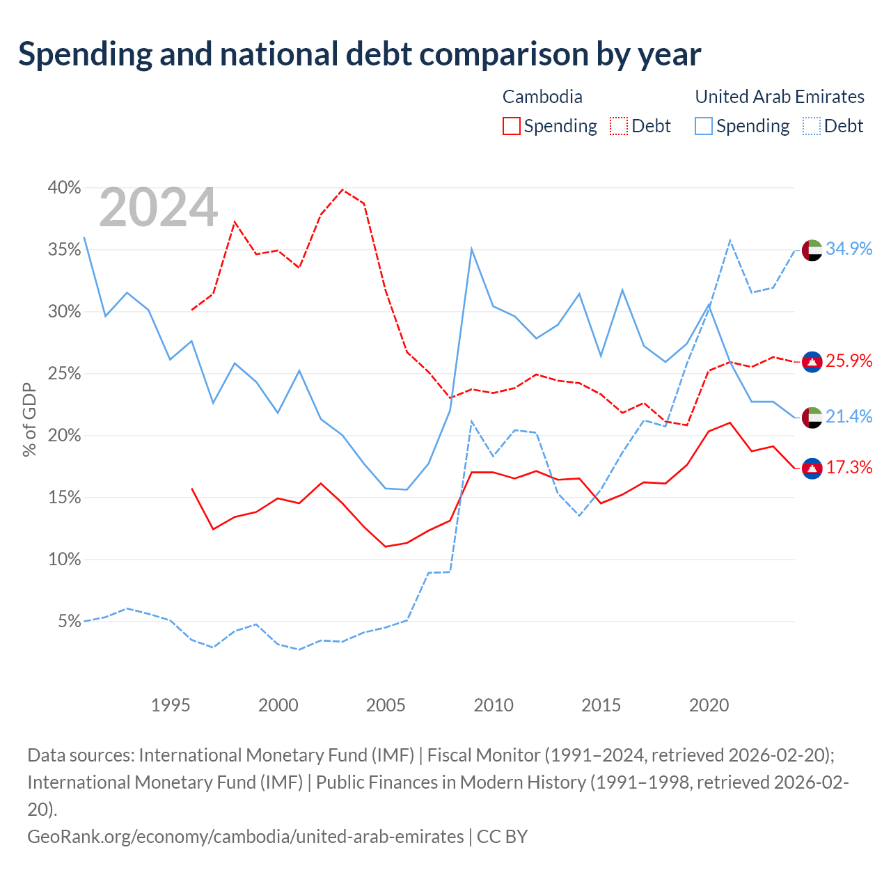 Cambodia has $12B in government debt (25.9% of GDP), compared to $193B (34.9% of GDP) in the United Arab Emirates.