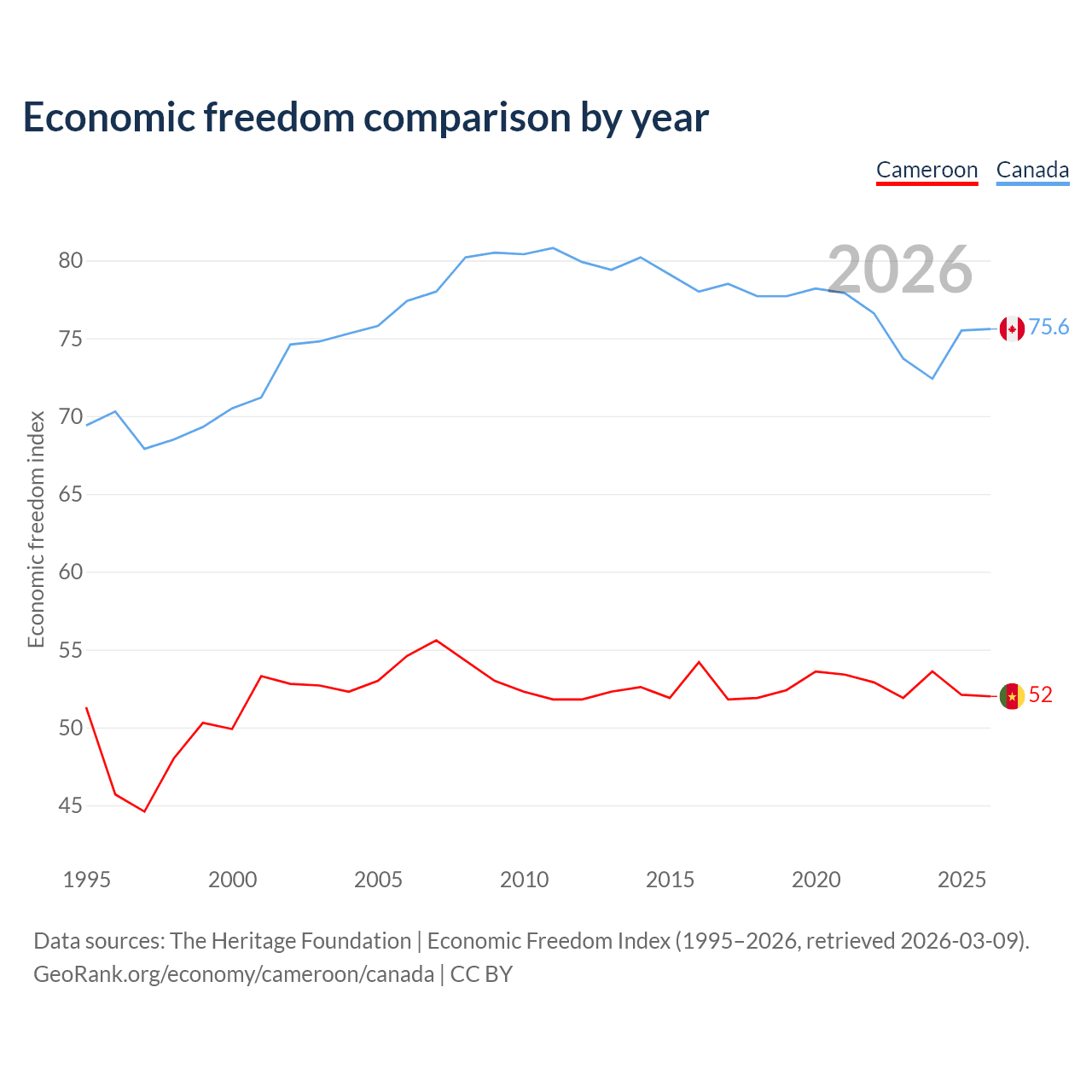The Economic Freedom Index for Cameroon is 52, ranking 151/197, compared to 75.6 for Canada, ranking 17/197. The chart above displays a comparison of annual changes in economic freedom indexes.