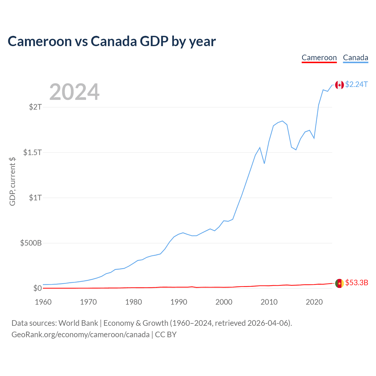Cameroon has a GDP of $53.3B compared to $2.24T for Canada, ranking 91/197 and 9/197 by economy size, respectively.