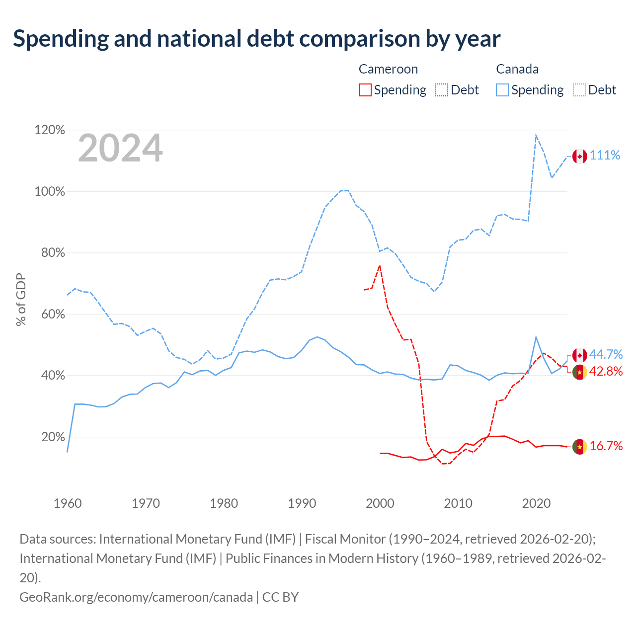 Cameroon has $22.8B in government debt (42.8% of GDP), compared to $2.5T (111.3% of GDP) in Canada.