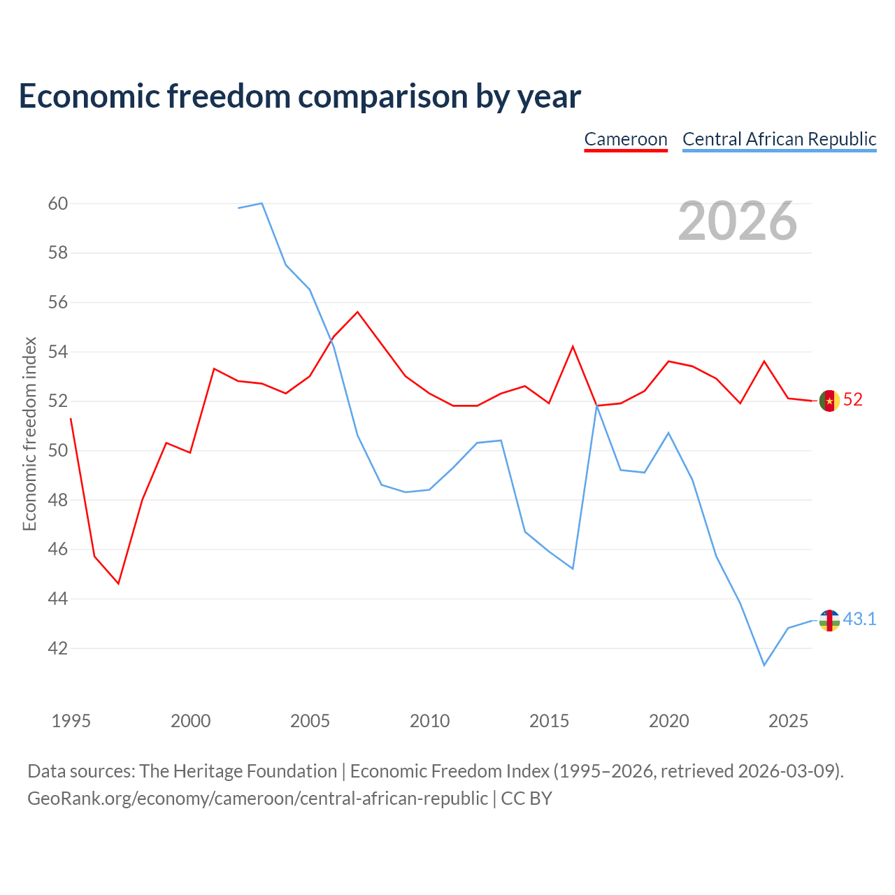 The Economic Freedom Index for Cameroon is 52, ranking 151/197, compared to 43.1 for the Central African Republic, ranking 182/197. The chart above displays a comparison of annual changes in economic freedom indexes.