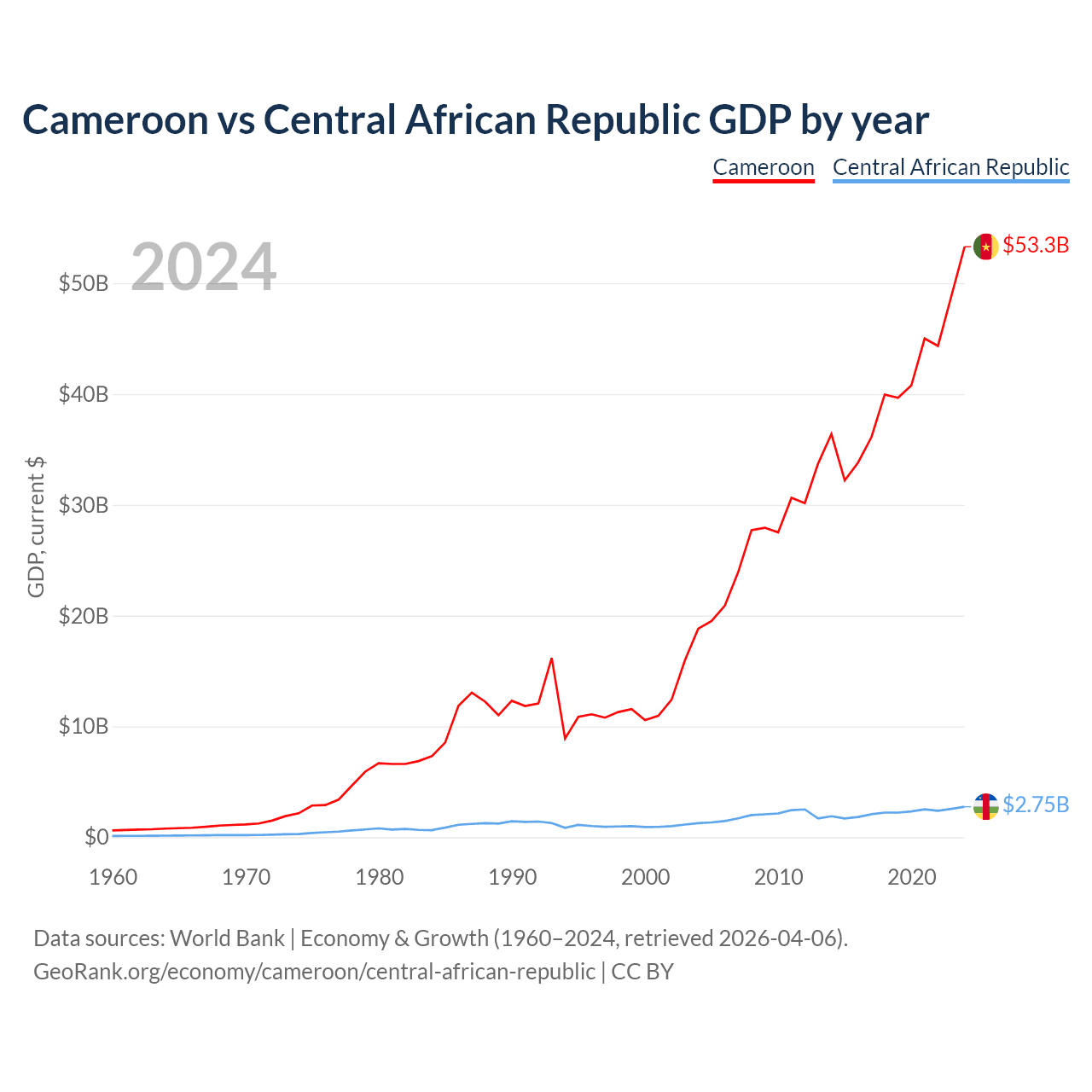 Cameroon has a GDP of $53.3B compared to $2.75B for the Central African Republic, ranking 91/197 and 171/197 by economy size, respectively.
