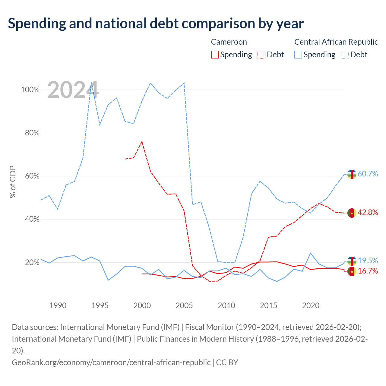 Cameroon has $22.8B in government debt (42.8% of GDP), compared to $1.67B (60.7% of GDP) in the Central African Republic.