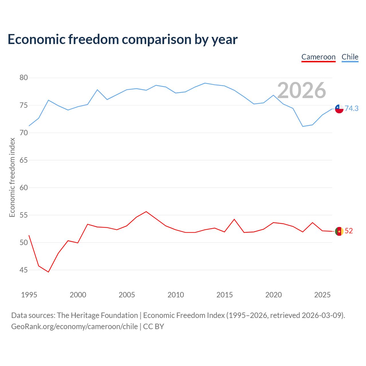 The Economic Freedom Index for Cameroon is 52, ranking 151/197, compared to 74.3 for Chile, ranking 20/197. The chart above displays a comparison of annual changes in economic freedom indexes.