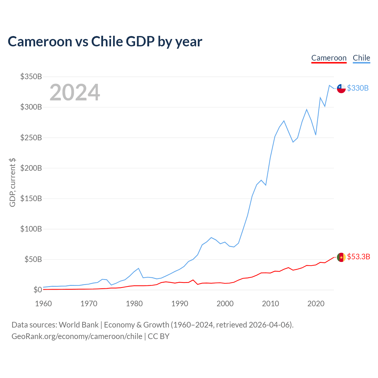 Cameroon has a GDP of $53.3B compared to $330B for Chile, ranking 91/197 and 45/197 by economy size, respectively.