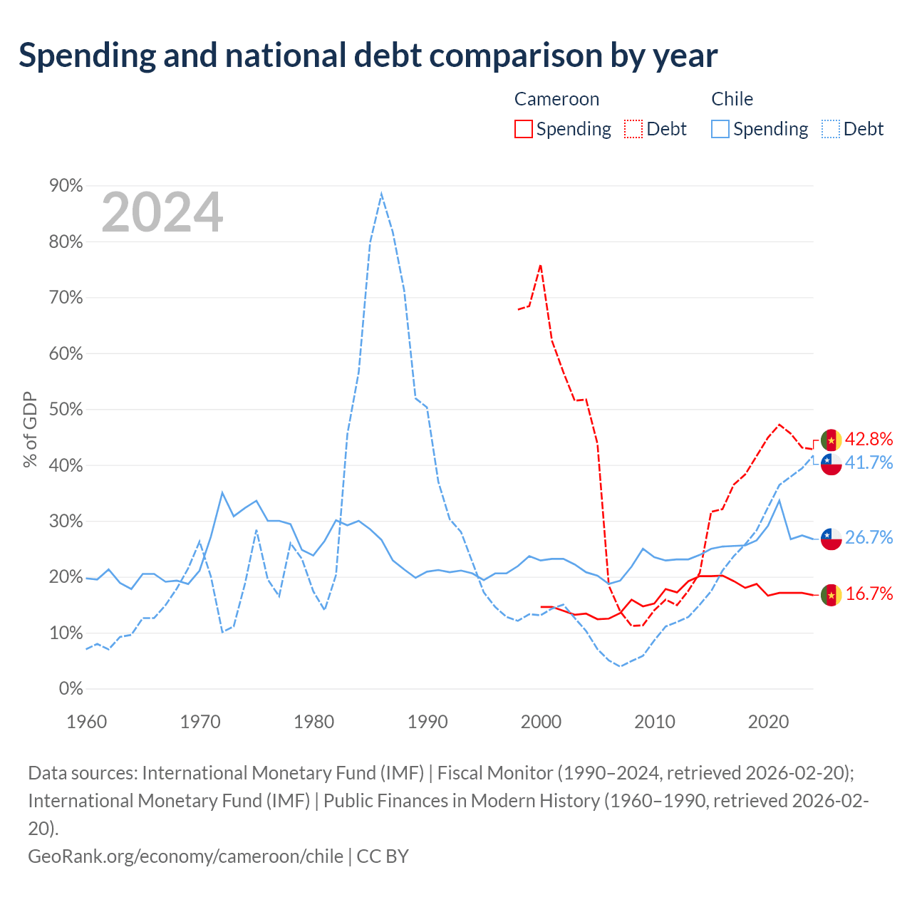 Cameroon has $22.8B in government debt (42.8% of GDP), compared to $138B (41.7% of GDP) in Chile.