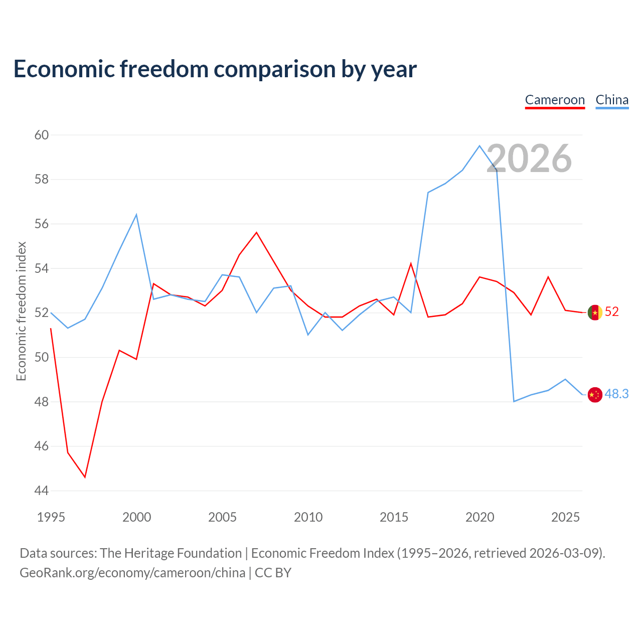 The Economic Freedom Index for Cameroon is 52, ranking 151/197, compared to 48.3 for China, ranking 170/197. The chart above displays a comparison of annual changes in economic freedom indexes.