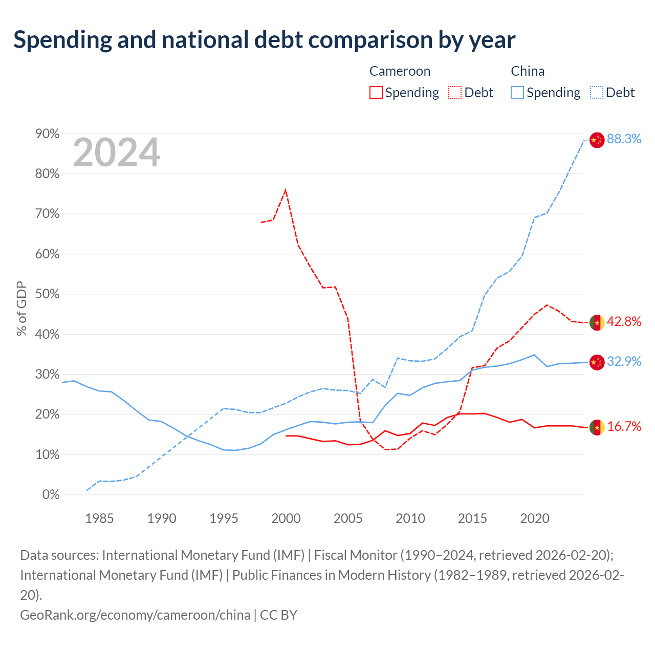 Cameroon has $22.8B in government debt (42.8% of GDP), compared to $16.6T (88.3% of GDP) in China.