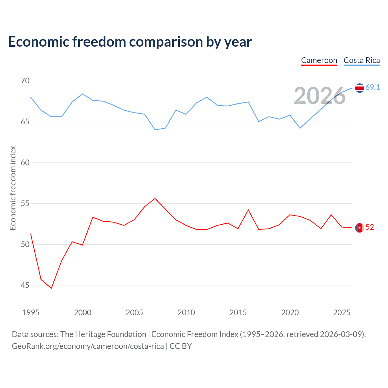 The Economic Freedom Index for Cameroon is 52, ranking 151/197, compared to 69.1 for Costa Rica, ranking 43/197. The chart above displays a comparison of annual changes in economic freedom indexes.