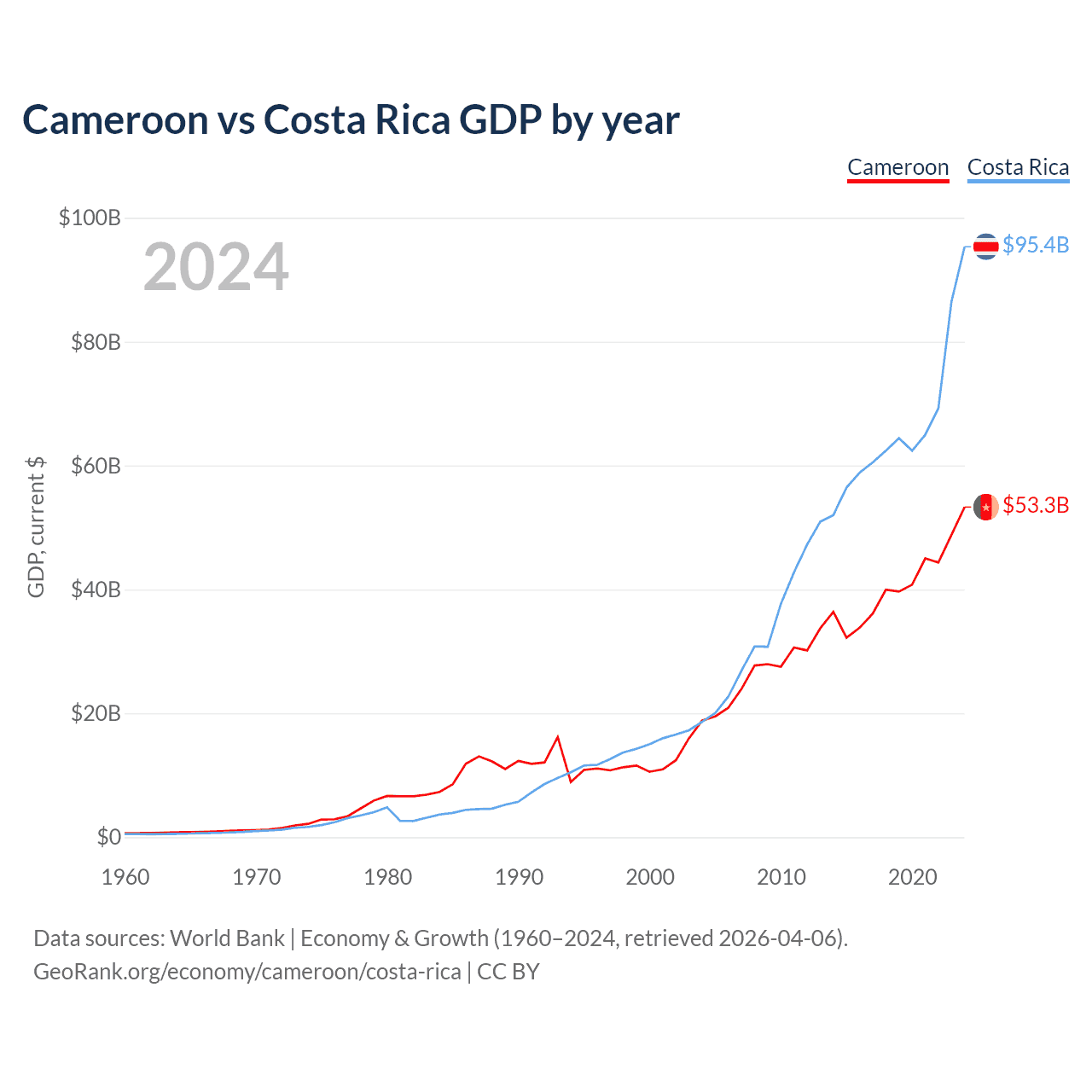 Cameroon has a GDP of $53.3B compared to $95.4B for Costa Rica, ranking 91/197 and 73/197 by economy size, respectively.