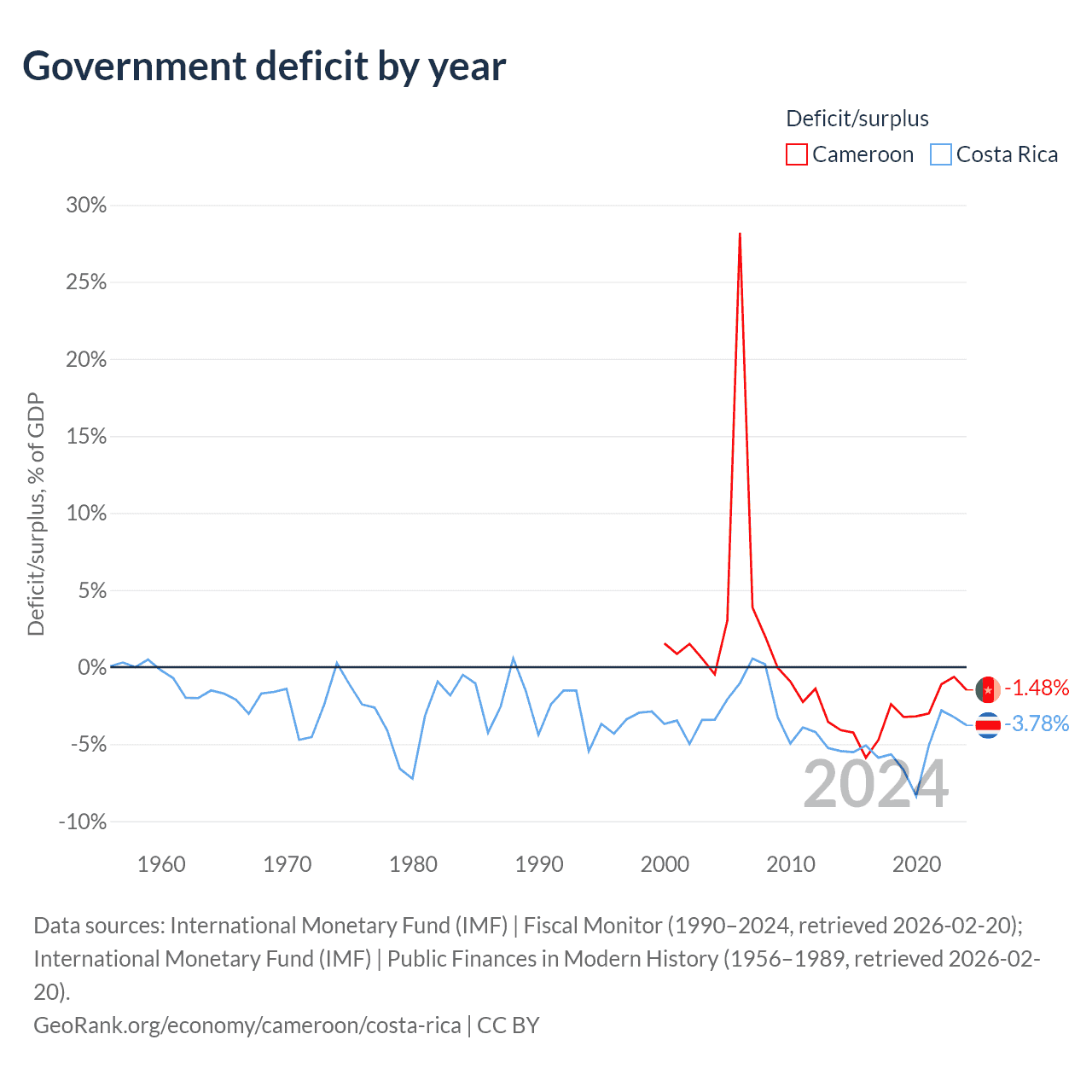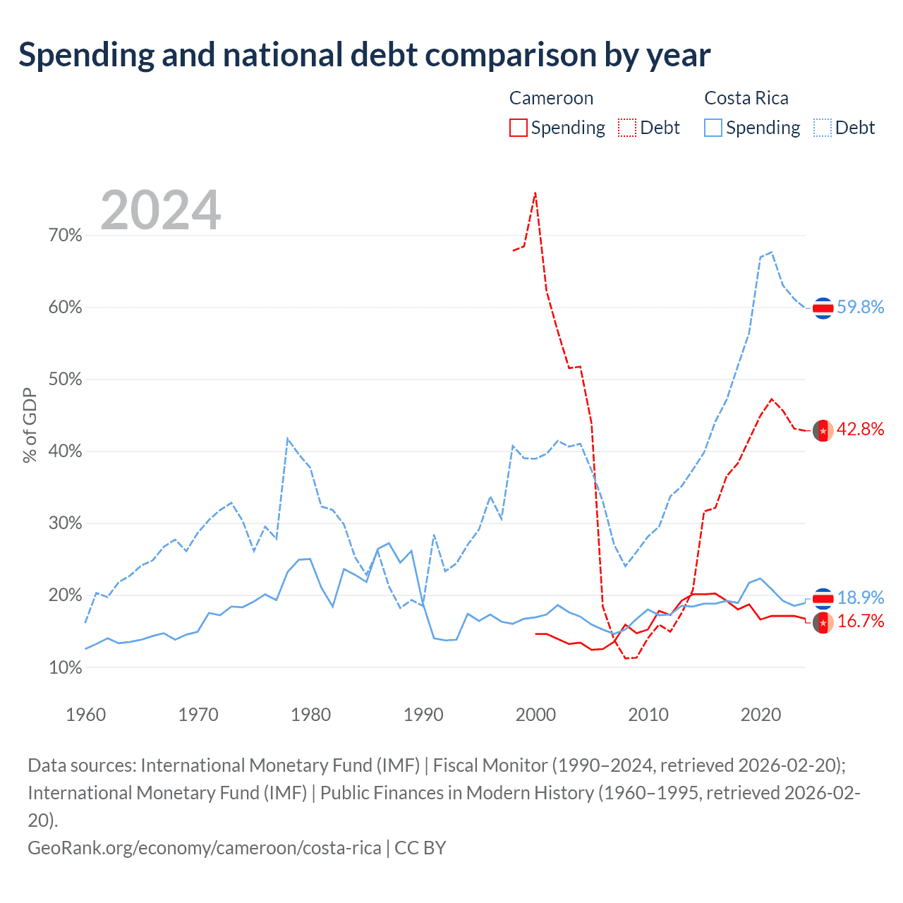 Cameroon has $22.8B in government debt (42.8% of GDP), compared to $57B (59.8% of GDP) in Costa Rica.