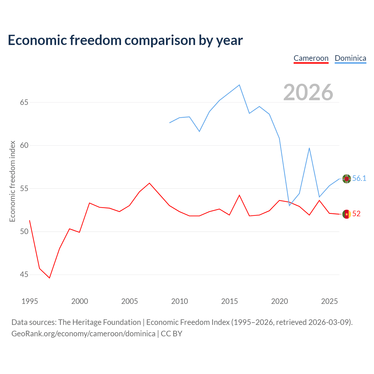 The Economic Freedom Index for Cameroon is 52, ranking 151/197, compared to 56.1 for Dominica, ranking 124/197. The chart above displays a comparison of annual changes in economic freedom indexes.