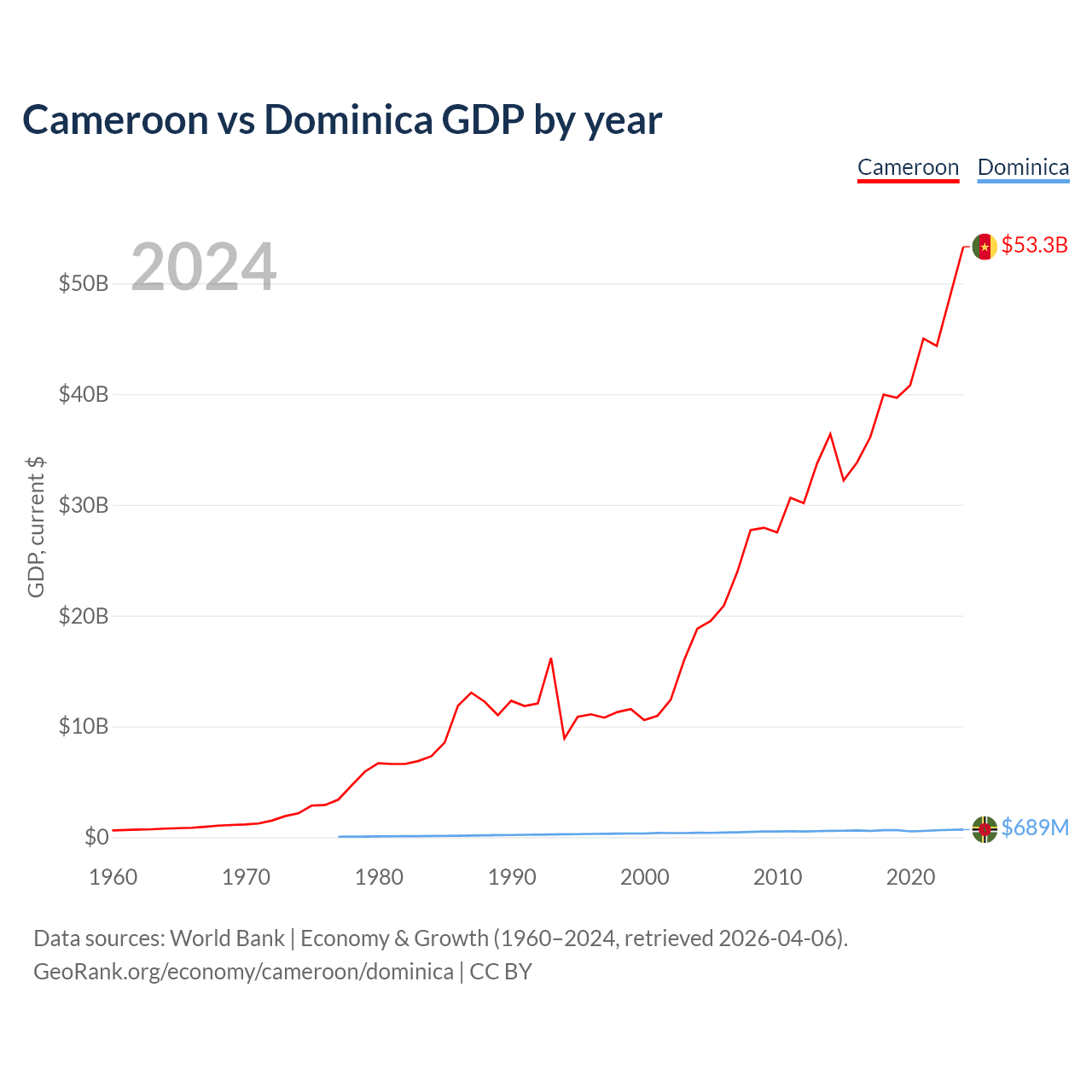 Cameroon has a GDP of $53.3B compared to $689M for Dominica, ranking 91/197 and 190/197 by economy size, respectively.