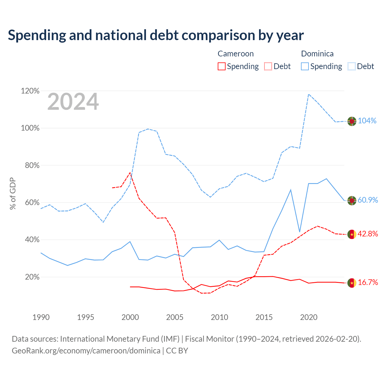 Cameroon has $22.8B in government debt (42.8% of GDP), compared to $713M (103.5% of GDP) in Dominica.