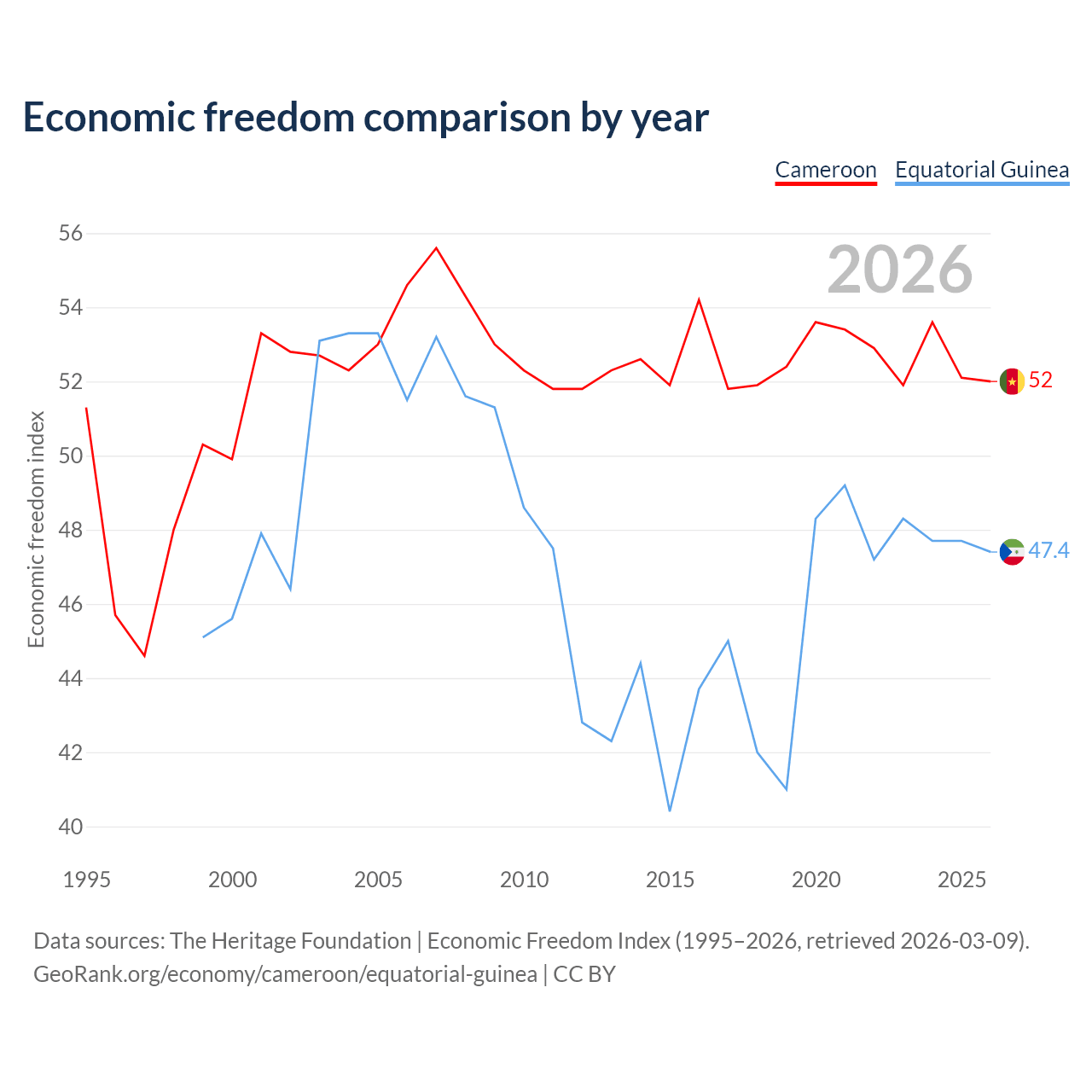 The Economic Freedom Index for Cameroon is 52, ranking 151/197, compared to 47.4 for Equatorial Guinea, ranking 175/197. The chart above displays a comparison of annual changes in economic freedom indexes.