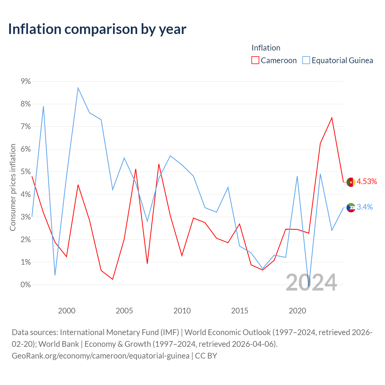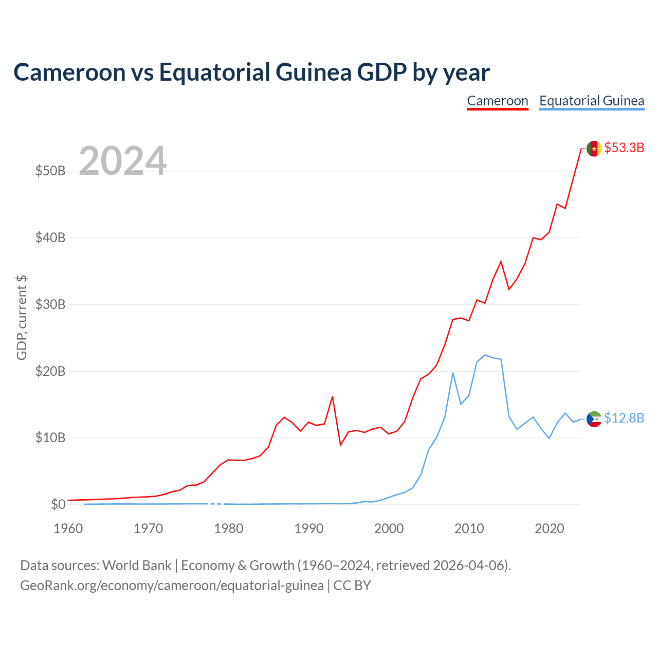 Cameroon has a GDP of $53.3B compared to $12.8B for Equatorial Guinea, ranking 91/197 and 148/197 by economy size, respectively.