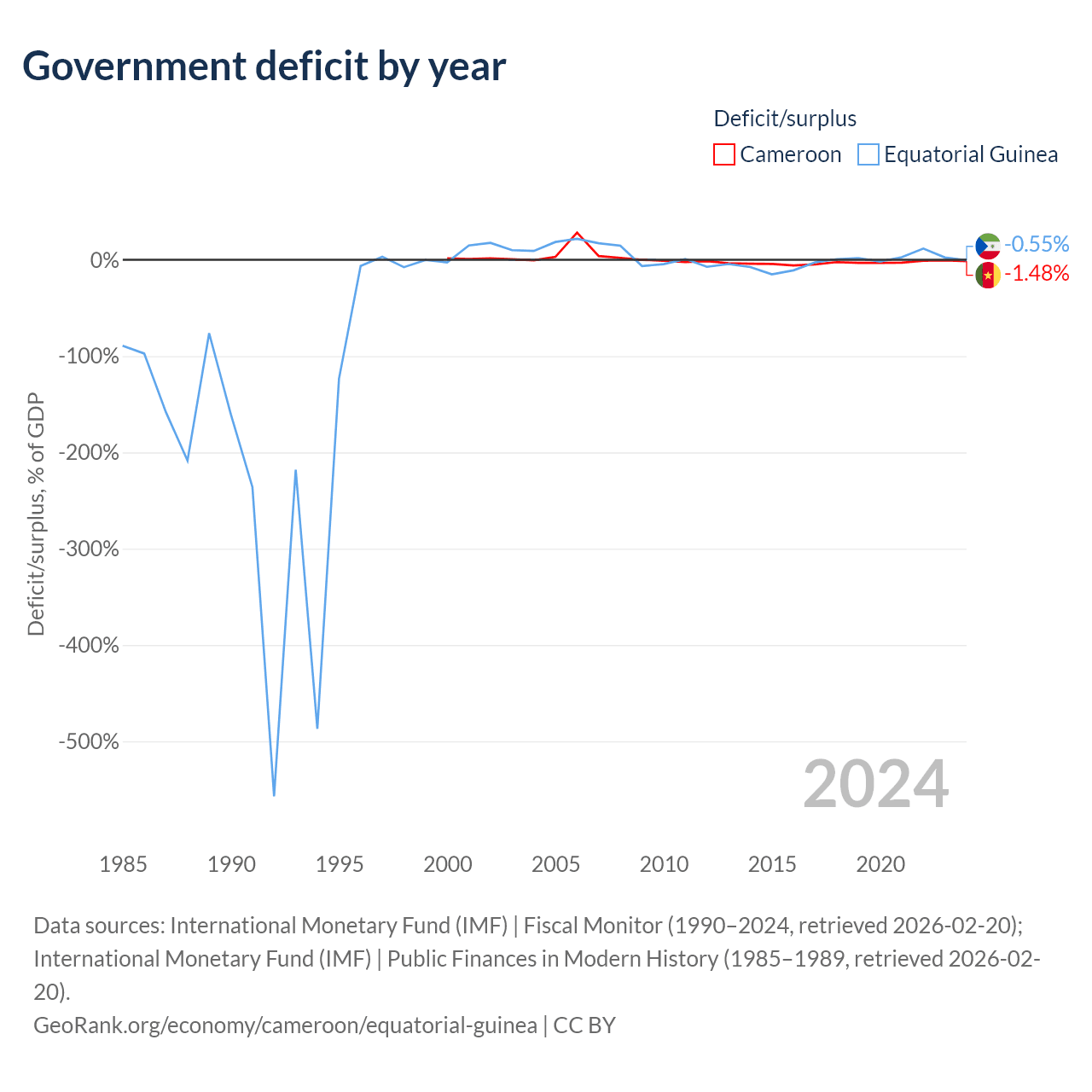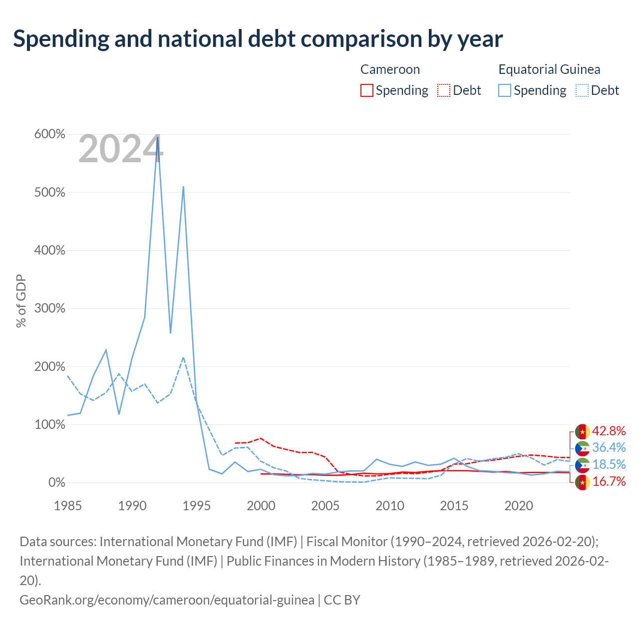 Cameroon has $22.8B in government debt (42.8% of GDP), compared to $4.65B (36.4% of GDP) in Equatorial Guinea.