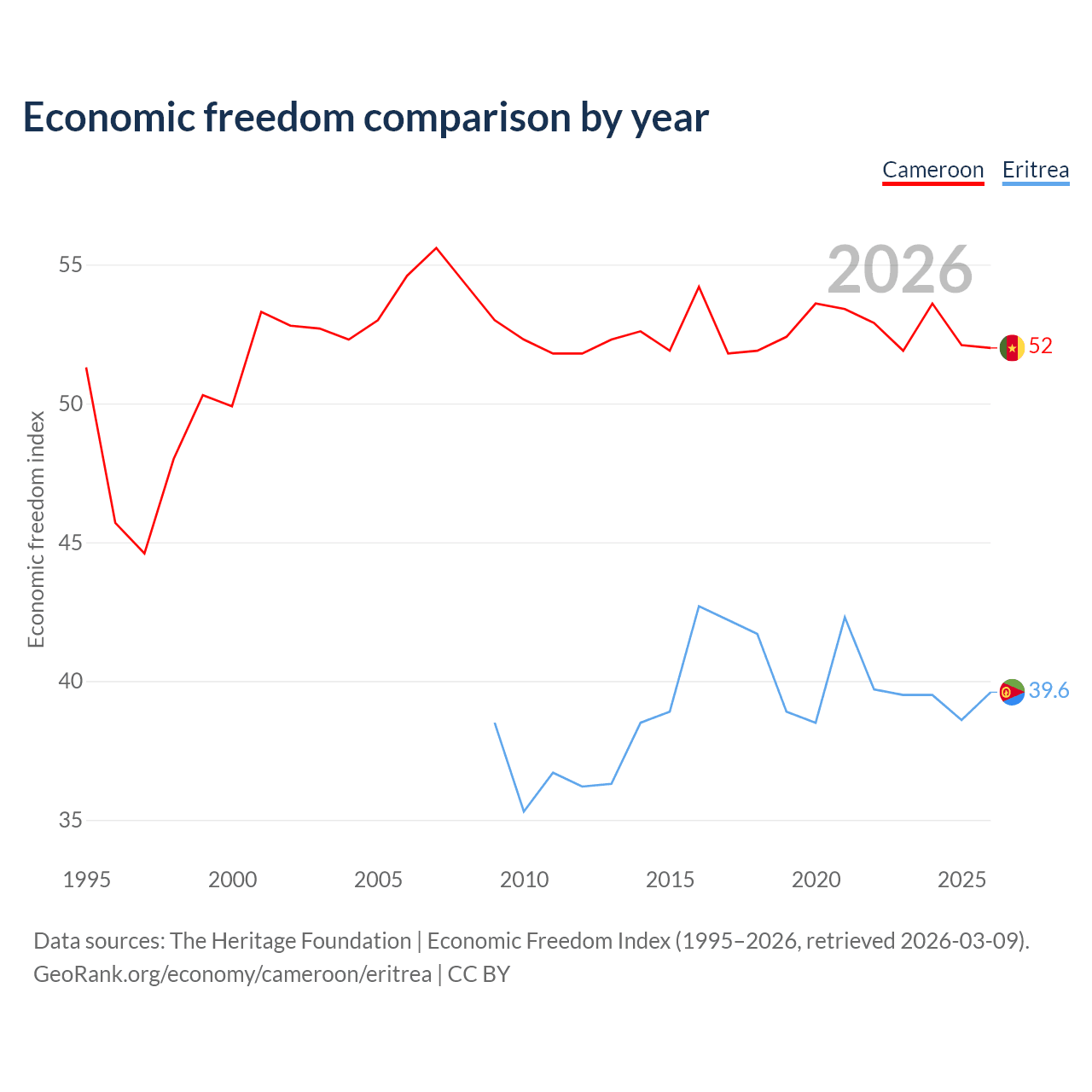 The Economic Freedom Index for Cameroon is 52, ranking 151/197, compared to 39.6 for Eritrea, ranking 188/197. The chart above displays a comparison of annual changes in economic freedom indexes.