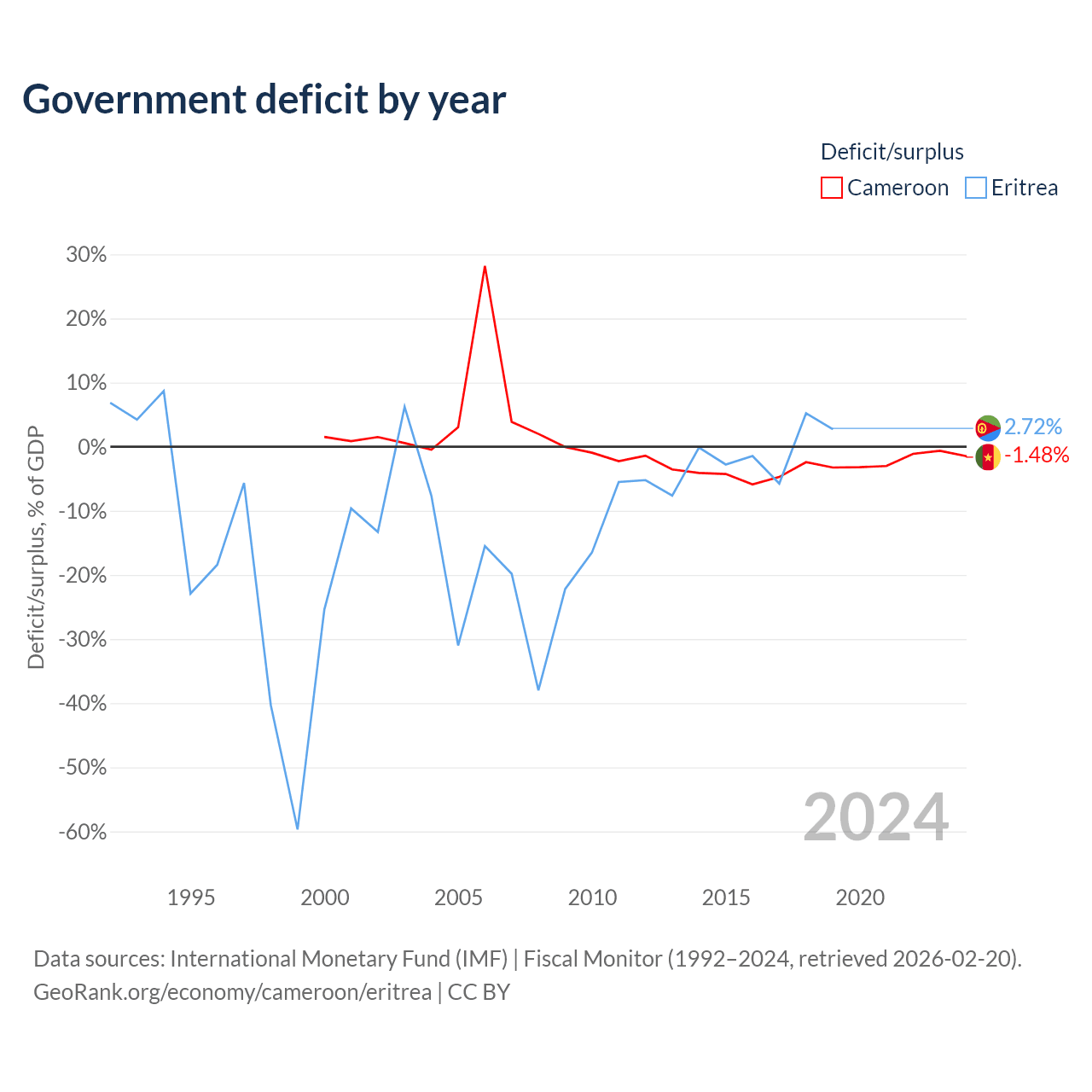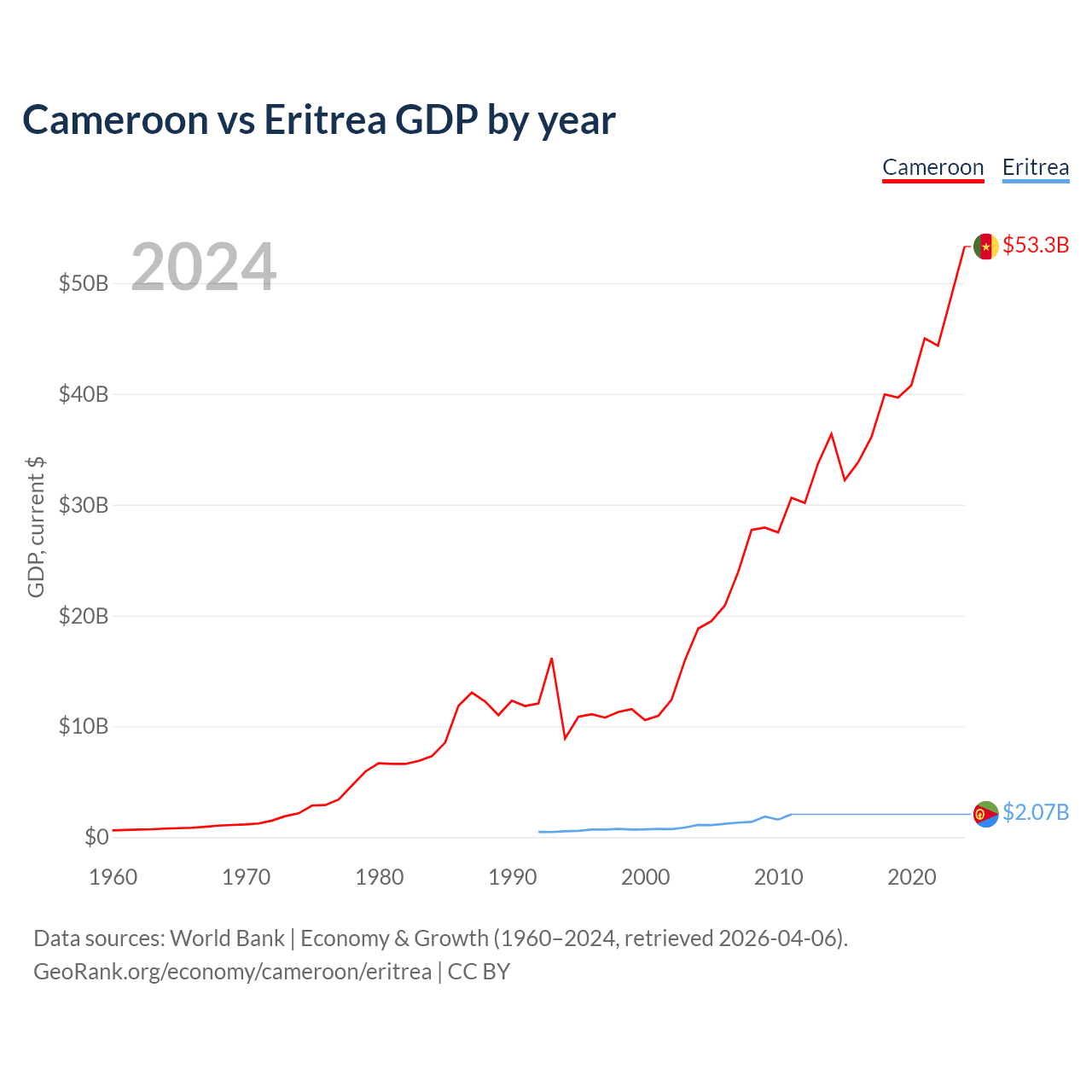 Cameroon has a GDP of $53.3B compared to $2.07B for Eritrea, ranking 91/197 and 179/197 by economy size, respectively.