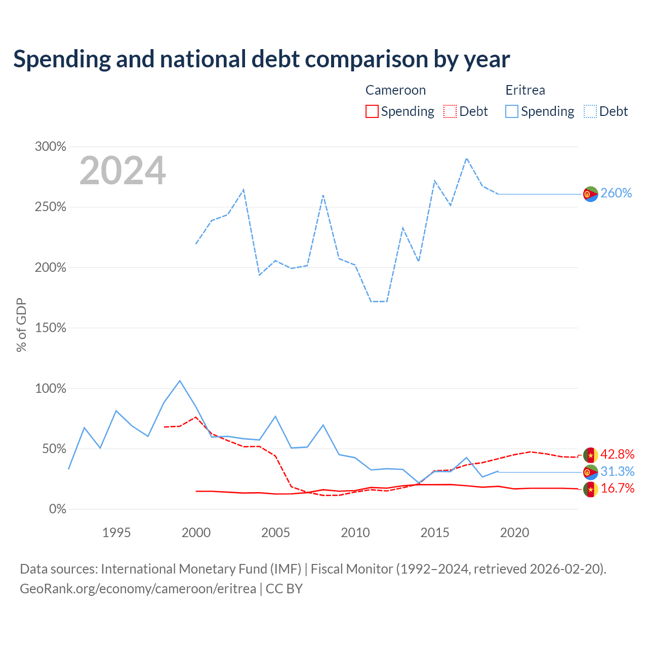 Cameroon has $22.8B in government debt (42.8% of GDP), compared to $3.54B (260.4% of GDP) in Eritrea.
