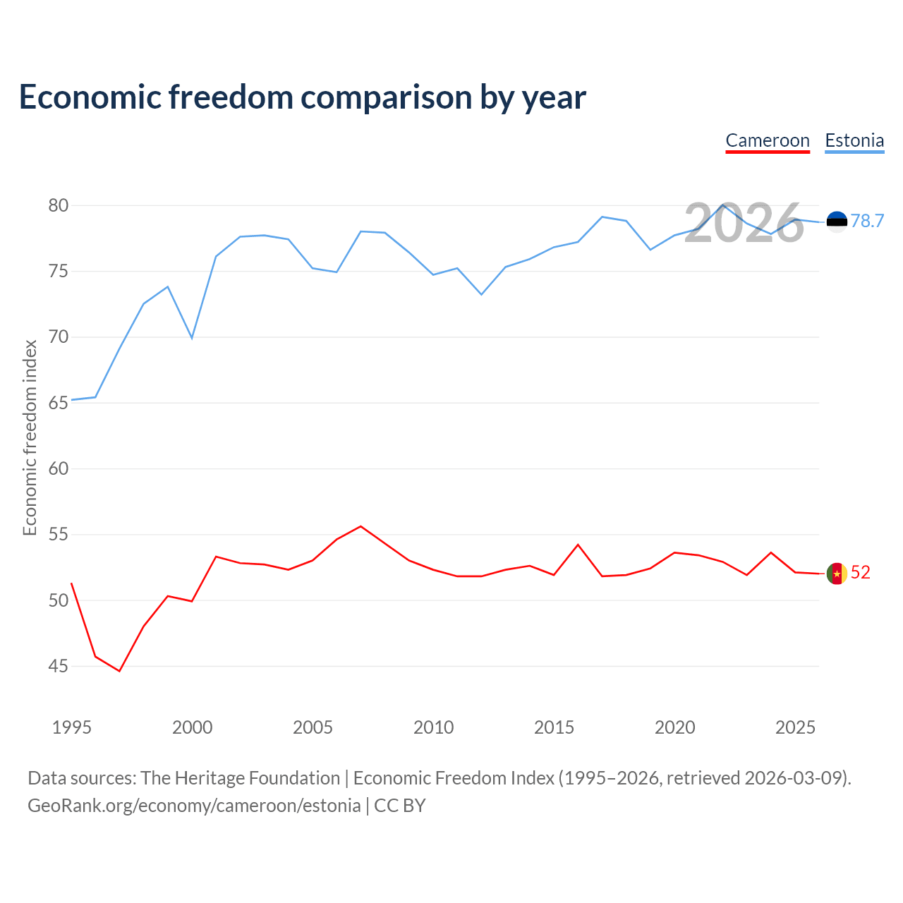 The Economic Freedom Index for Cameroon is 52, ranking 151/197, compared to 78.7 for Estonia, ranking 10/197. The chart above displays a comparison of annual changes in economic freedom indexes.