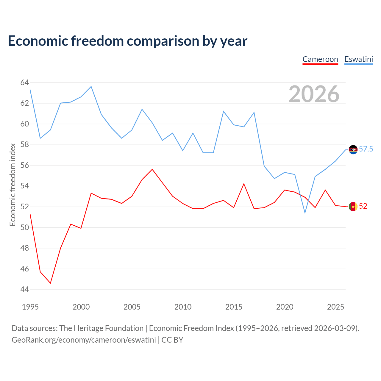 The Economic Freedom Index for Cameroon is 52, ranking 151/197, compared to 57.5 for Eswatini, ranking 116/197. The chart above displays a comparison of annual changes in economic freedom indexes.