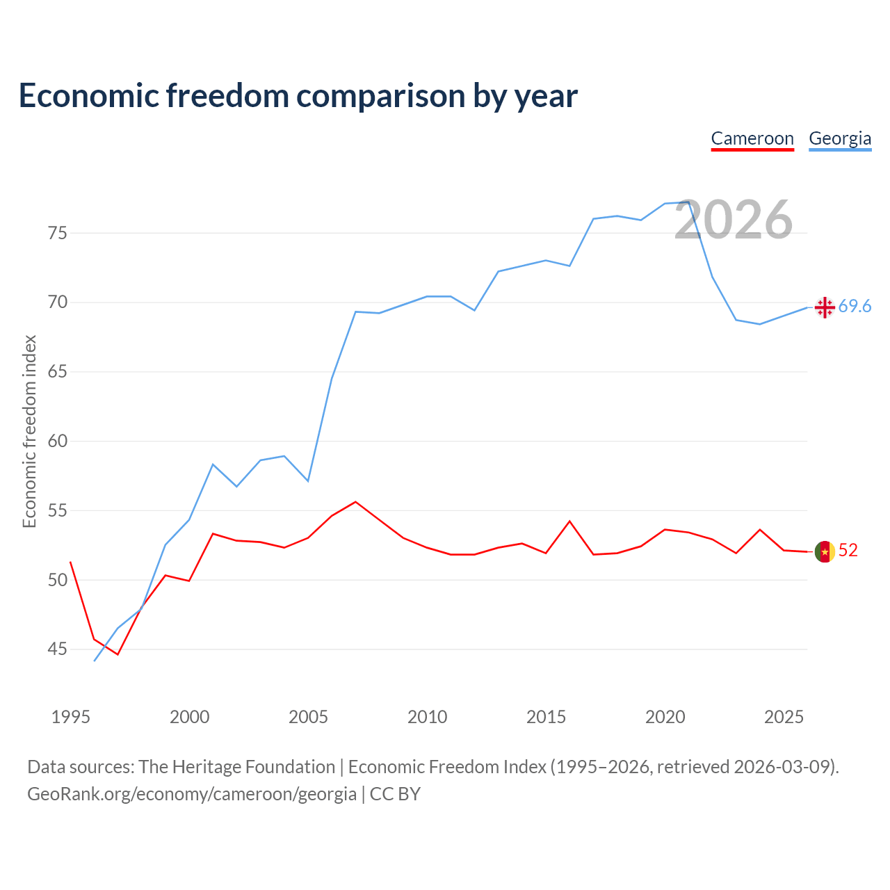 The Economic Freedom Index for Cameroon is 52, ranking 151/197, compared to 69.6 for Georgia, ranking 41/197. The chart above displays a comparison of annual changes in economic freedom indexes.