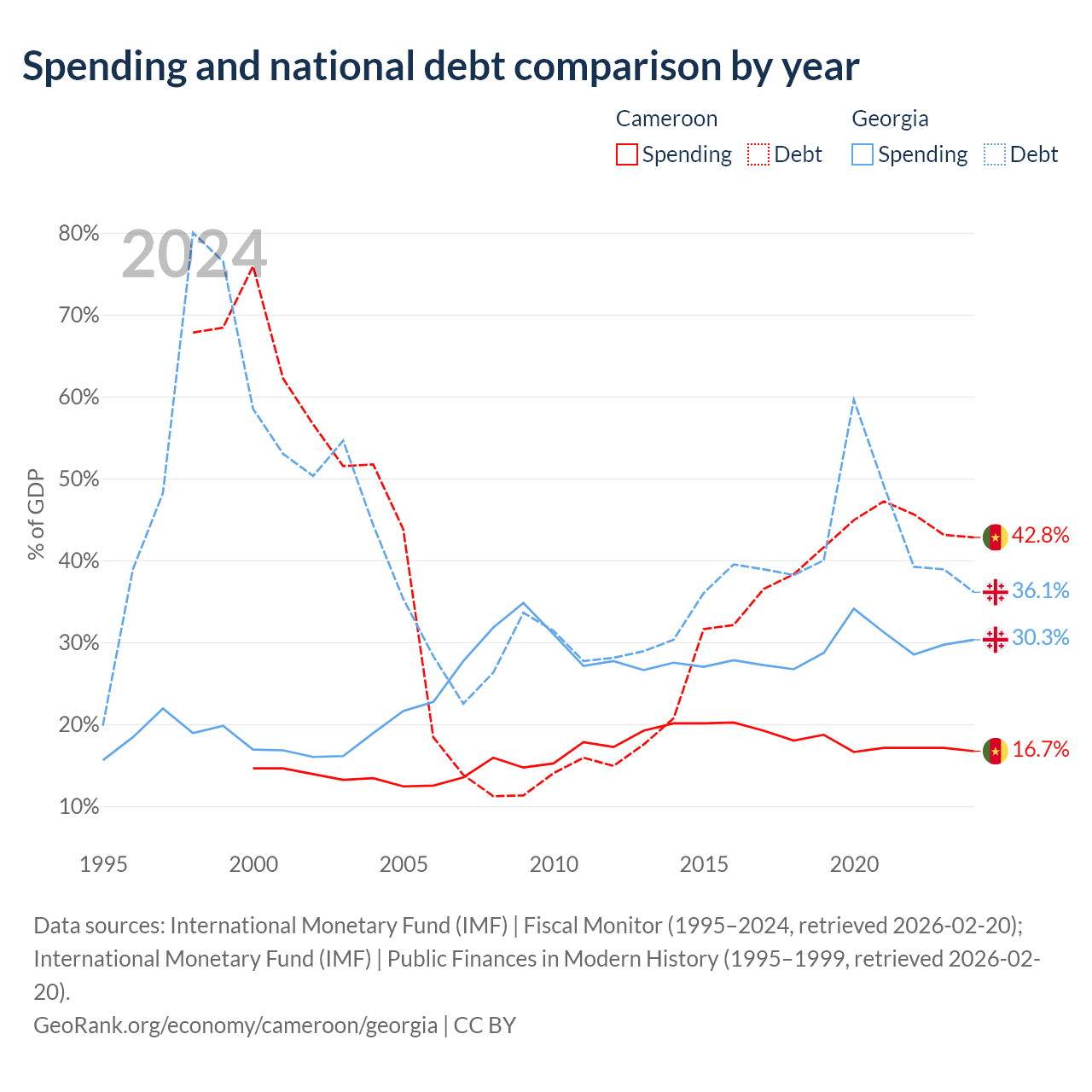 Cameroon has $22.8B in government debt (42.8% of GDP), compared to $12.3B (36.1% of GDP) in Georgia.