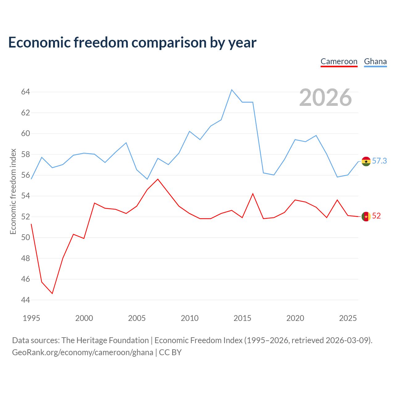 The Economic Freedom Index for Cameroon is 52, ranking 151/197, compared to 57.3 for Ghana, ranking 118/197. The chart above displays a comparison of annual changes in economic freedom indexes.