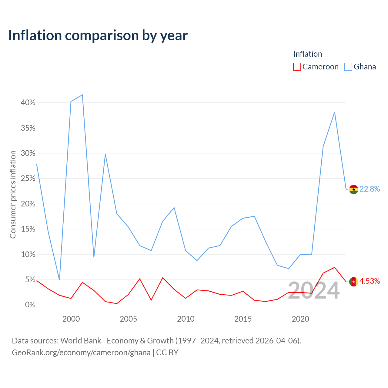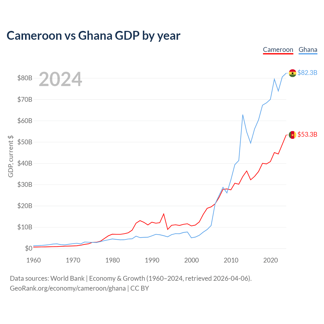 Cameroon has a GDP of $53.3B compared to $82.3B for Ghana, ranking 91/197 and 80/197 by economy size, respectively.