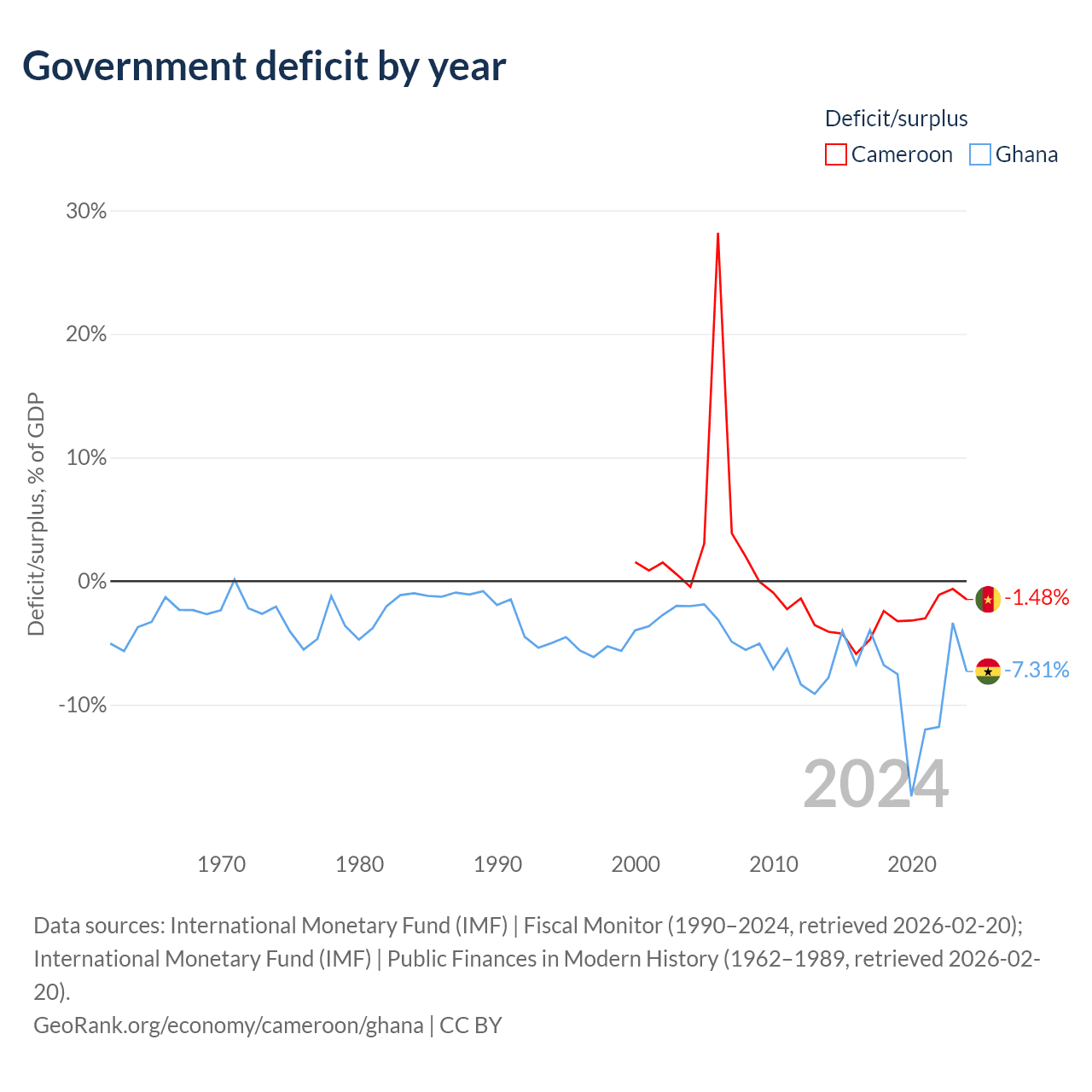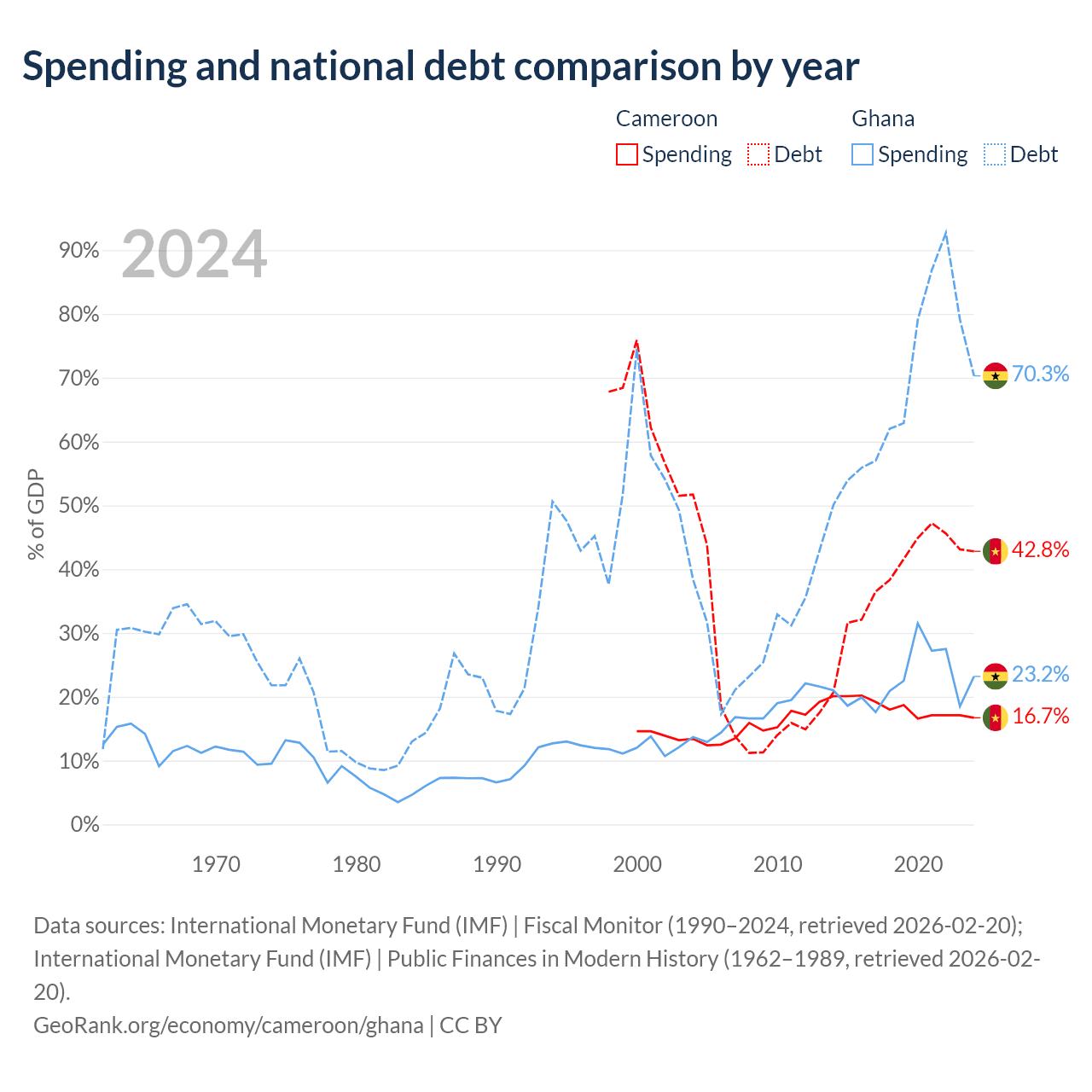 Cameroon has $22.8B in government debt (42.8% of GDP), compared to $57.9B (70.3% of GDP) in Ghana.