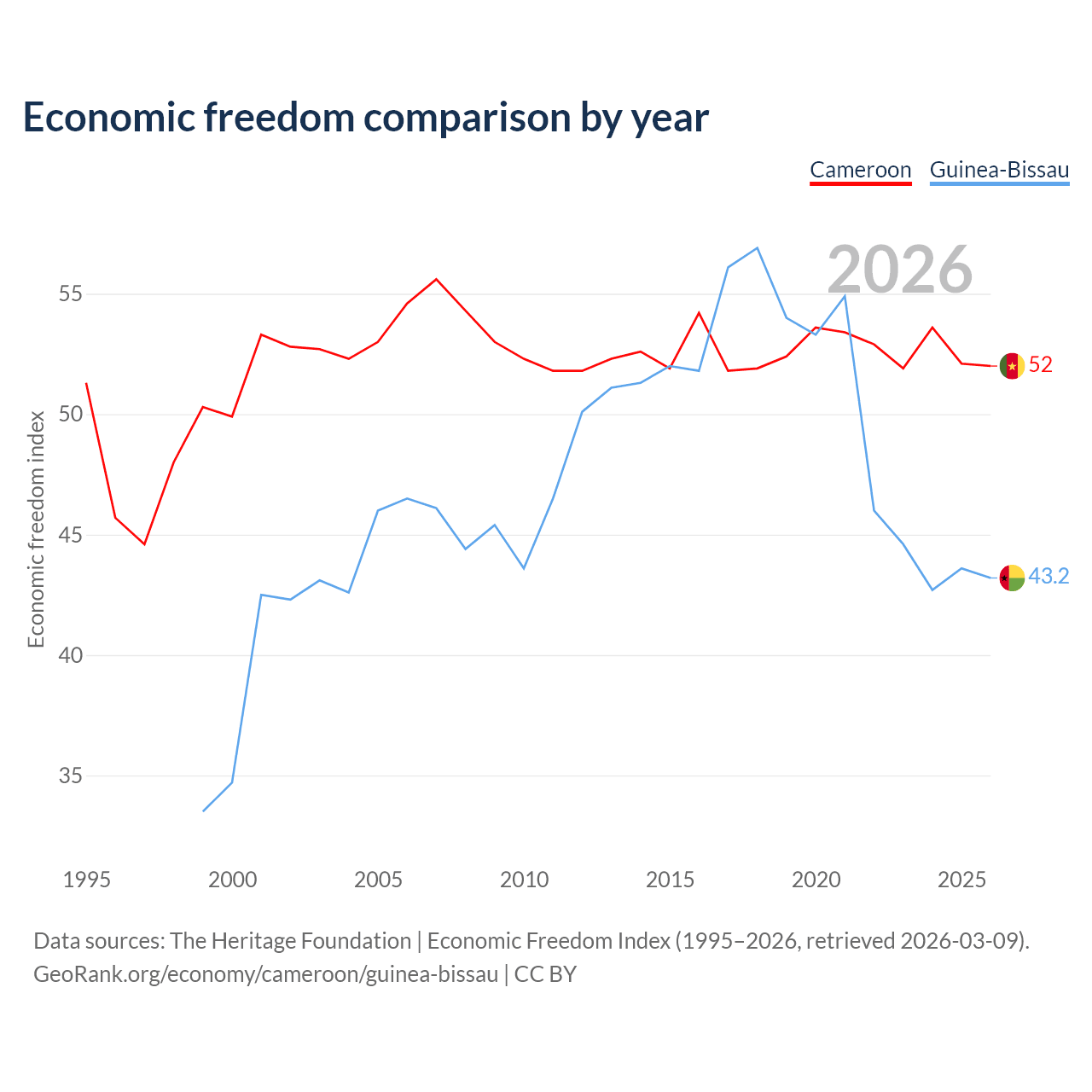The Economic Freedom Index for Cameroon is 52, ranking 151/197, compared to 43.2 for Guinea-Bissau, ranking 181/197. The chart above displays a comparison of annual changes in economic freedom indexes.