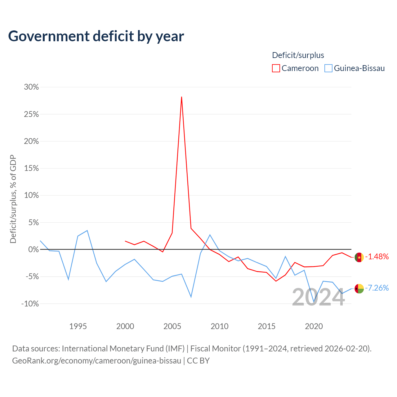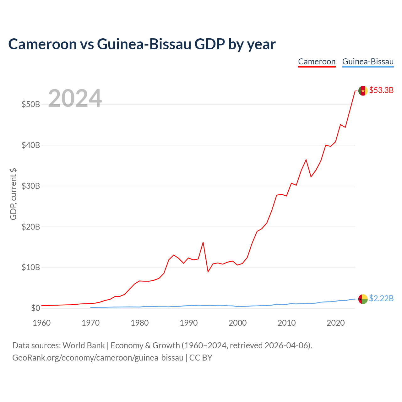 Cameroon has a GDP of $53.3B compared to $2.22B for Guinea-Bissau, ranking 91/197 and 176/197 by economy size, respectively.