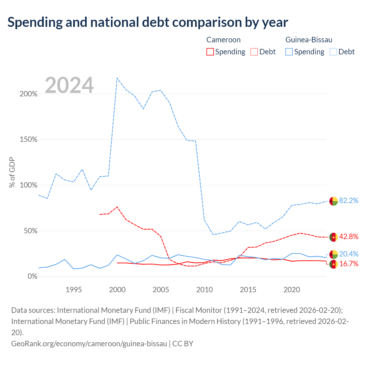Cameroon has $22.8B in government debt (42.8% of GDP), compared to $1.82B (82.2% of GDP) in Guinea-Bissau.