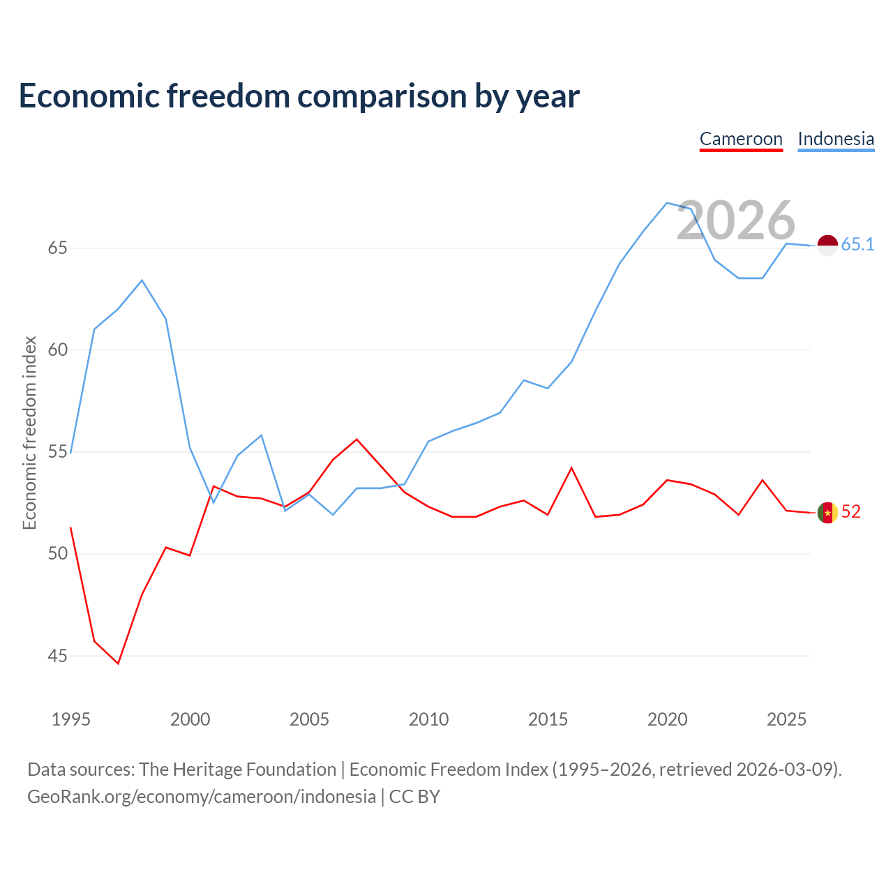 The Economic Freedom Index for Cameroon is 52, ranking 151/197, compared to 65.1 for Indonesia, ranking 67/197. The chart above displays a comparison of annual changes in economic freedom indexes.