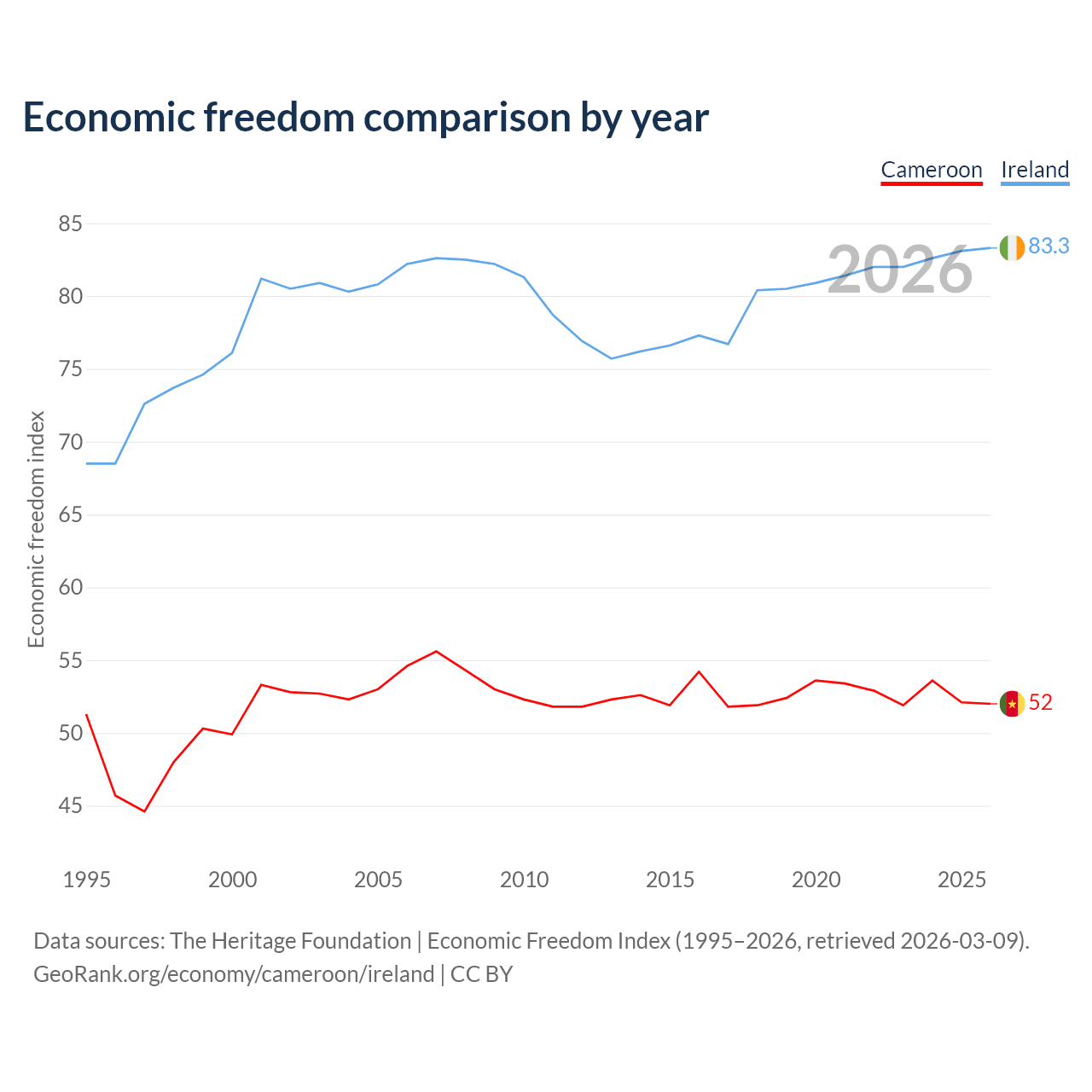 The Economic Freedom Index for Cameroon is 52, ranking 151/197, compared to 83.3 for Ireland, ranking 3/197. The chart above displays a comparison of annual changes in economic freedom indexes.