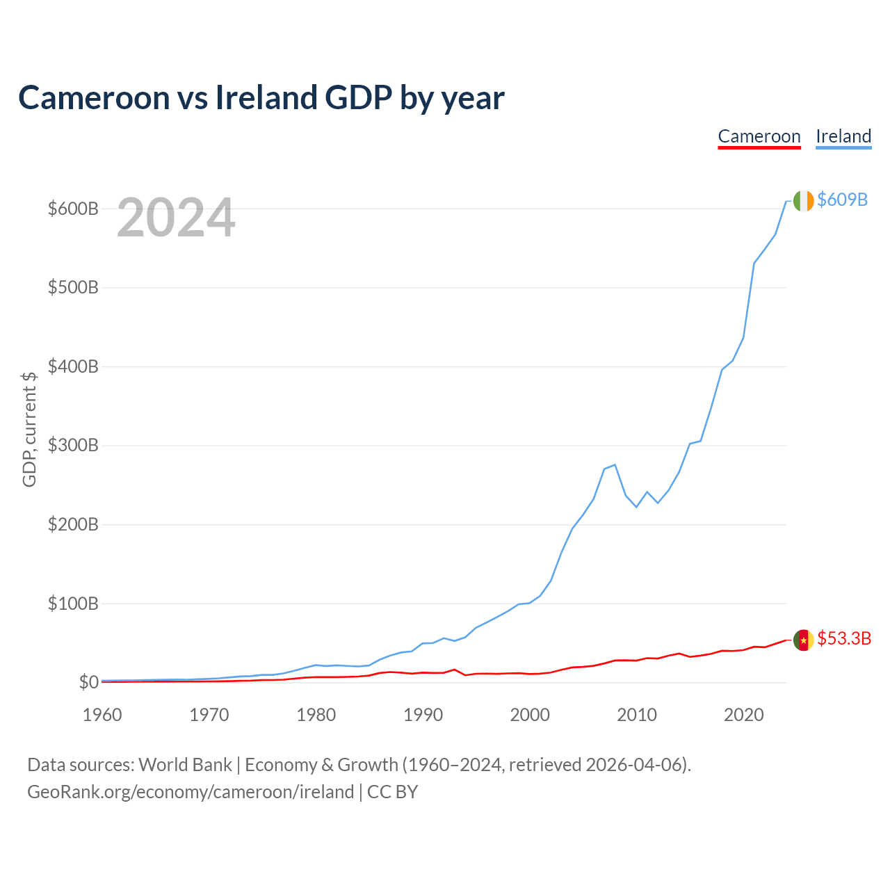 Cameroon has a GDP of $53.3B compared to $609B for Ireland, ranking 91/197 and 25/197 by economy size, respectively.