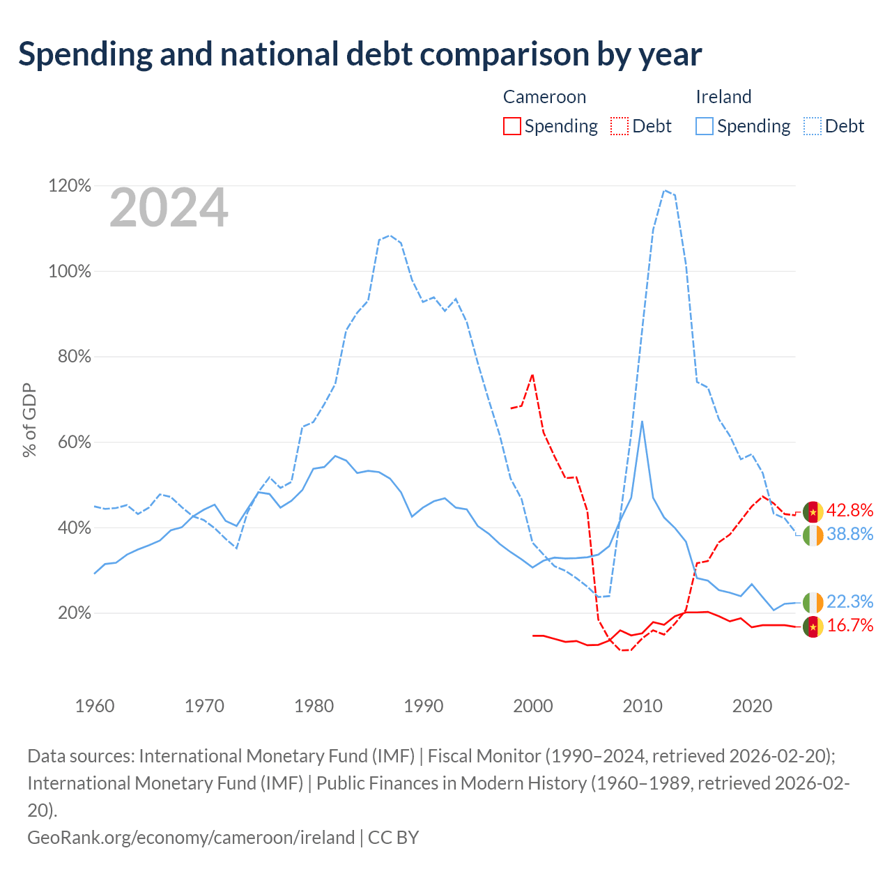 Cameroon has $22.8B in government debt (42.8% of GDP), compared to $236B (38.8% of GDP) in Ireland.