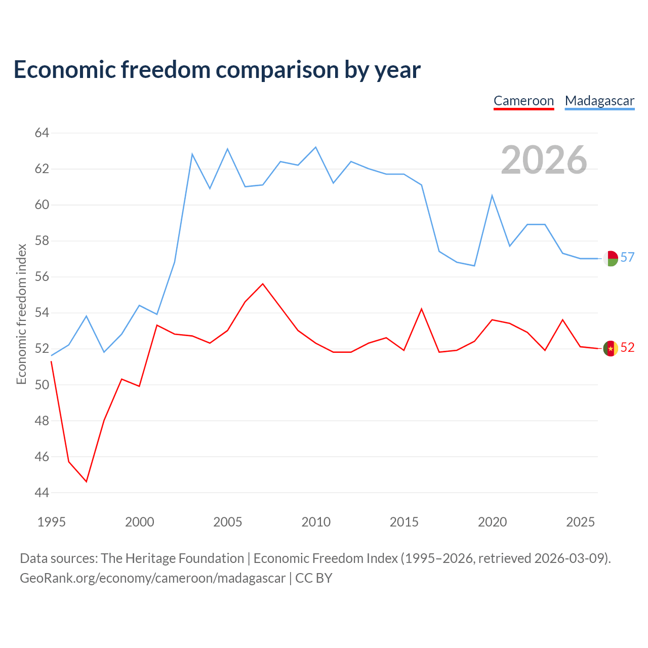 The Economic Freedom Index for Cameroon is 52, ranking 151/197, compared to 57 for Madagascar, ranking 119/197. The chart above displays a comparison of annual changes in economic freedom indexes.
